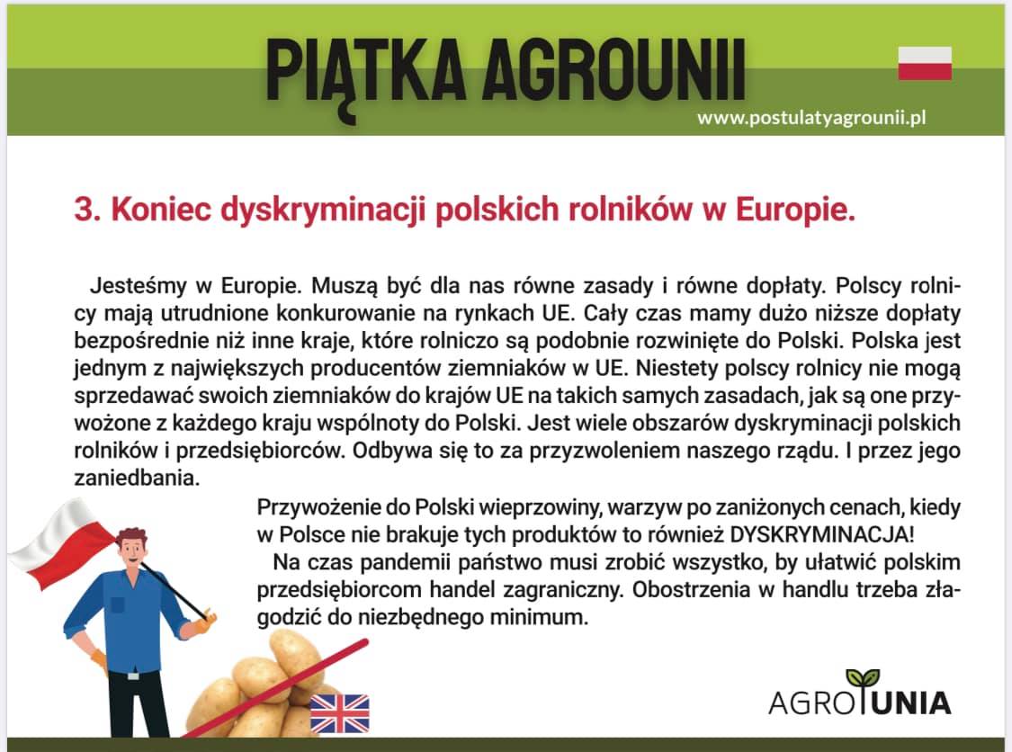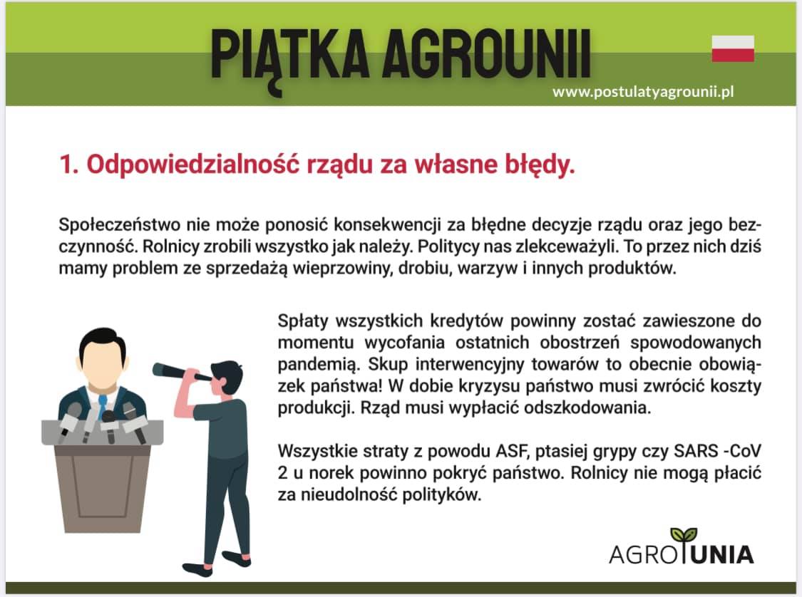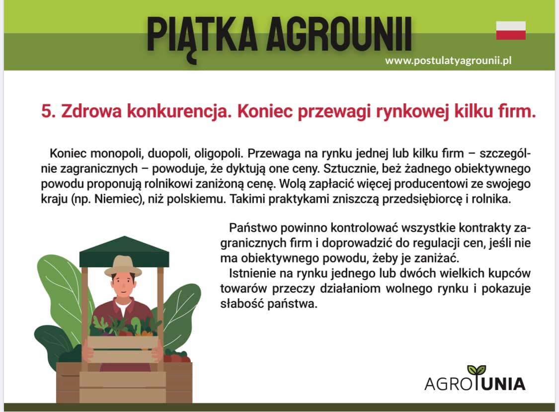 AGROUNIA żyje w jakimś nierealnym absurdalnym świecie , 31 lat temu wprowadzono w naszym kraju wolny rynek a za jego wprowadzeniem bardzo stanowczo naciskała polska wieś już w latach osiemdziesiątych między innymi wylewając mleko do rowów i wstrzymując się z dostawą żywca do punktów skupu a dzisiaj chcą ponownego wprowadzenia gospodarki ręcznie sterowanej jak w PRL-u.