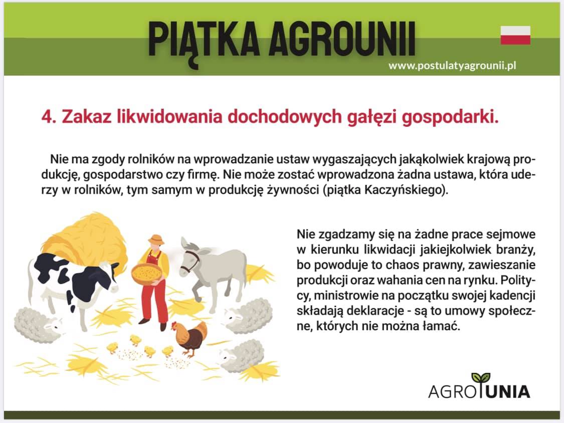 Zapytaliśmy posła również o to, jak ocenia zaprezentowaną w poniedziałek tzw. „Piątkę Agrounii”, a więc postulaty tego stowarzyszenia. Mowa w nich o: