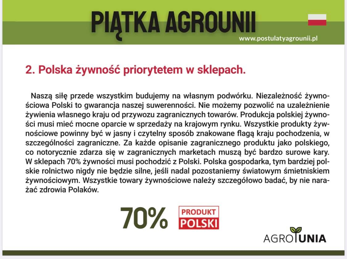– Wśród postulatów Agrounii poza tymi rozsądnymi są też zupełnie życzeniowe. Na pewno oznaczanie tego, z którego kraju pochodzenia produktu jest rzeczą ważną i o to trzeba walczyć. To bardzo ważny postulat. Natomiast restrykcyjne wprowadzenie produktów krajowych, a nie obcych prawdopodobnie byłoby łamaniem prawa unijnego. Należy pamiętać, że jesteśmy na wolnym rynku. Tak samo nasze towary za granicą, byłoby uderzeniem rykoszetem w eksport. Nie można patrzeć tylko na siebie, nie respektując prawa do importu innych producentów – podkreślił poseł Ławniczak.