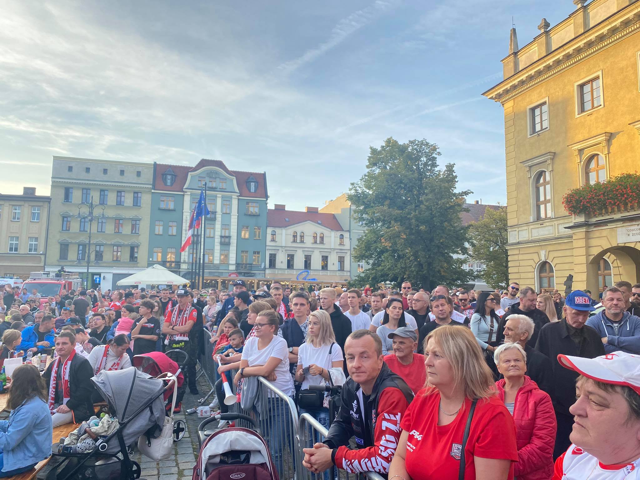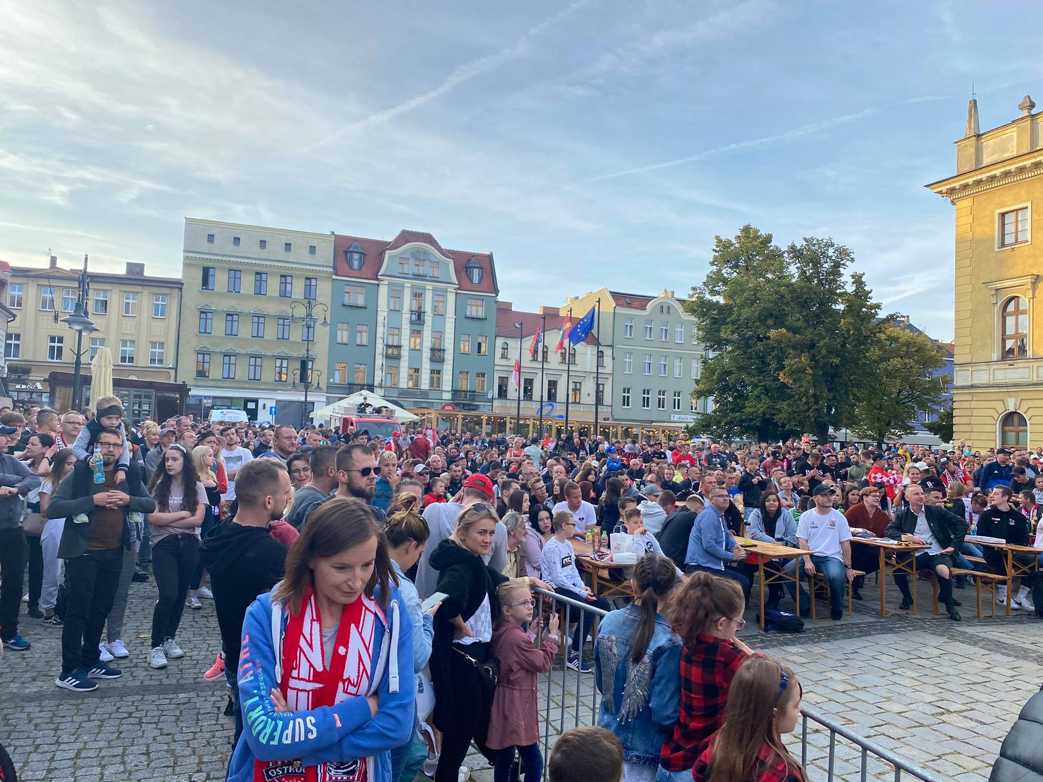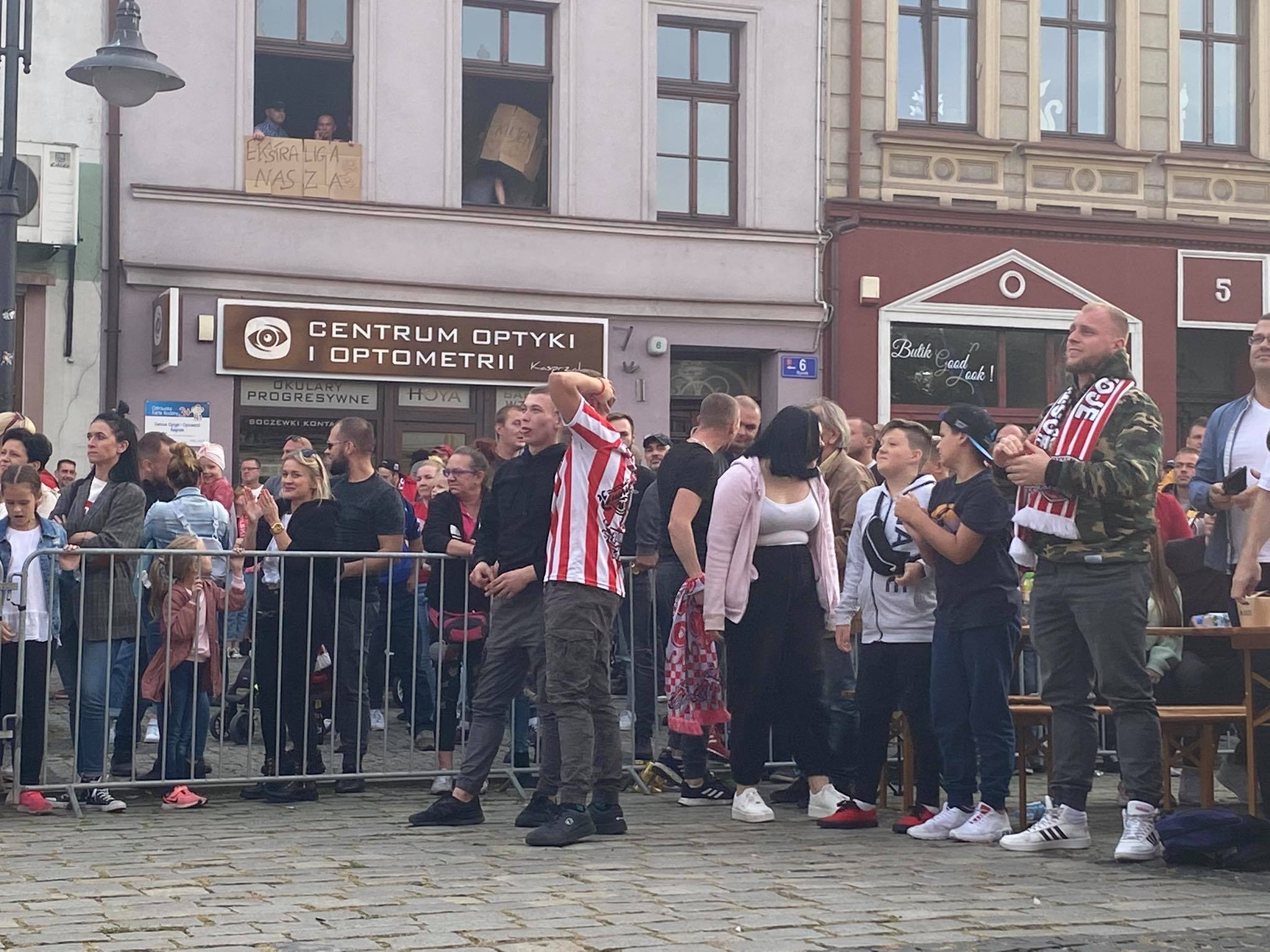 Na ostrowskim Rynku trwa dopingowanie i świętowanie. Strefa kibica jest szczelnie wypełniona. Kibice oglądają mecz w Krośnie i cieszą się z historycznego awansu. Zobaczcie, jak wygląda feta.