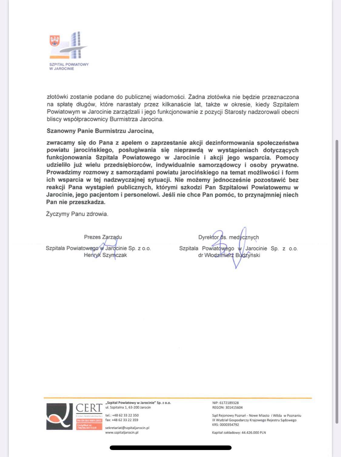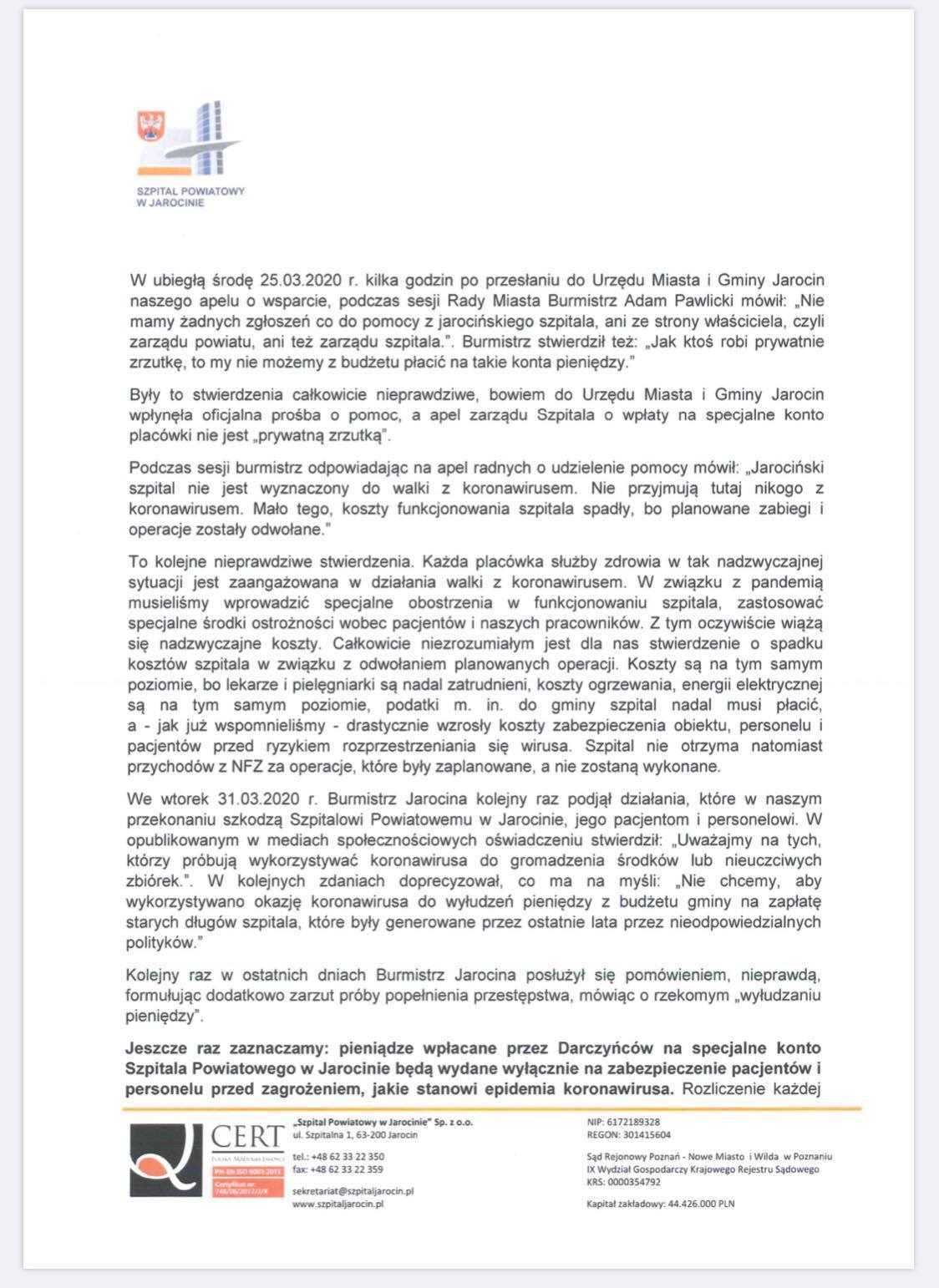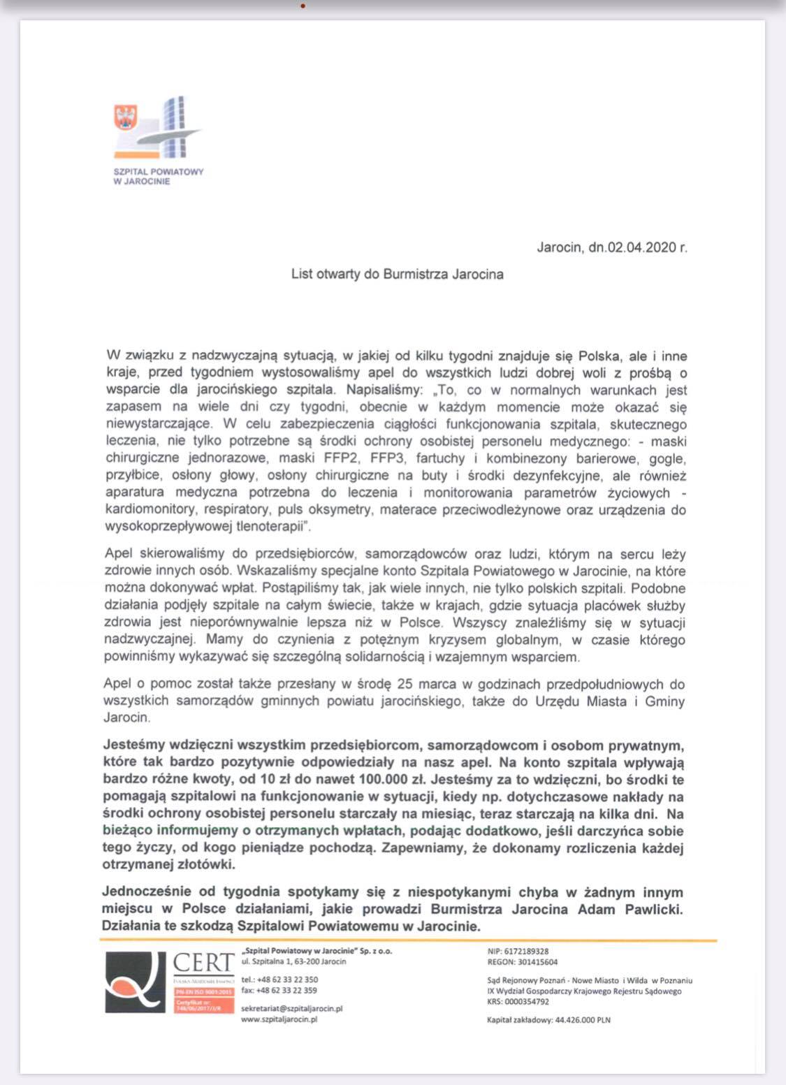 Prezes Zarządu Szpitala Powiatowego w Jarocinie Henryk Szymczak i dyrektor ds. medycznych dr Włodzimierz Budzyński, którzy podpisali się pod listem, na koniec skierowali do Adama Pawlickiego te słowa: „Zwracamy się do Pana z apelem o zaprzestanie akcji dezinformowania społeczeństwa powiatu jarocińskiego, posługiwania się nieprawdą w wystąpieniach dotyczących funkcjonowania Szpitala Powiatowego w Jarocinie i akcji jego wsparcia. Pomocy udzieliło już wielu przedsiębiorców, indywidualnie samorządowcy i osoby prywatne. Prowadzimy rozmowy z samorządami powiatu jarocińskiego na temat możliwości i form ich wsparcia w tej nadzwyczajnej sytuacji. Nie możemy jednocześnie pozostawić bez reakcji Pana wystąpień publicznych, którymi szkodzi Pan Szpitalowi Powiatowemu w Jarocinie, jego pacjentom i personelowi. Jeśli nie chce Pan pomóc, to przynajmniej niech Pan nie przeszkadza”.