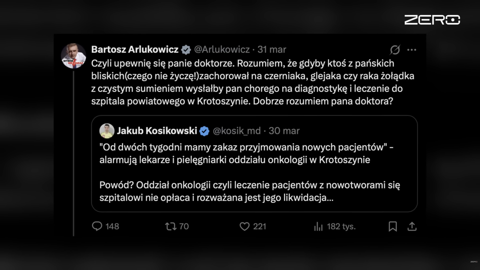 W swoim stylu skomentowali całą sytuację piętnując wypowiedź Bartosza Arłukowicza (ministra zdrowia z Platformy Obywatelskiej w latach 2011-2015 za rządów Donalda Tuska i Ewy Kopacz), oraz wyszydzając jego wypowiedź. Arłukowicz napisał 31 marca w serwisie X: „Czyli upewnię się panie doktorze. Rozumiem, że gdyby ktoś z pańskich bliskich (czego nie życzę!) zachorował na czerniaka, glejaka czy raka żołądka z czystym sumieniem wysłałby pan chorego na diagnostykę i leczenie do szpitala powiatowego w Krotoszynie. Dobrze rozumiem pana doktora?”.