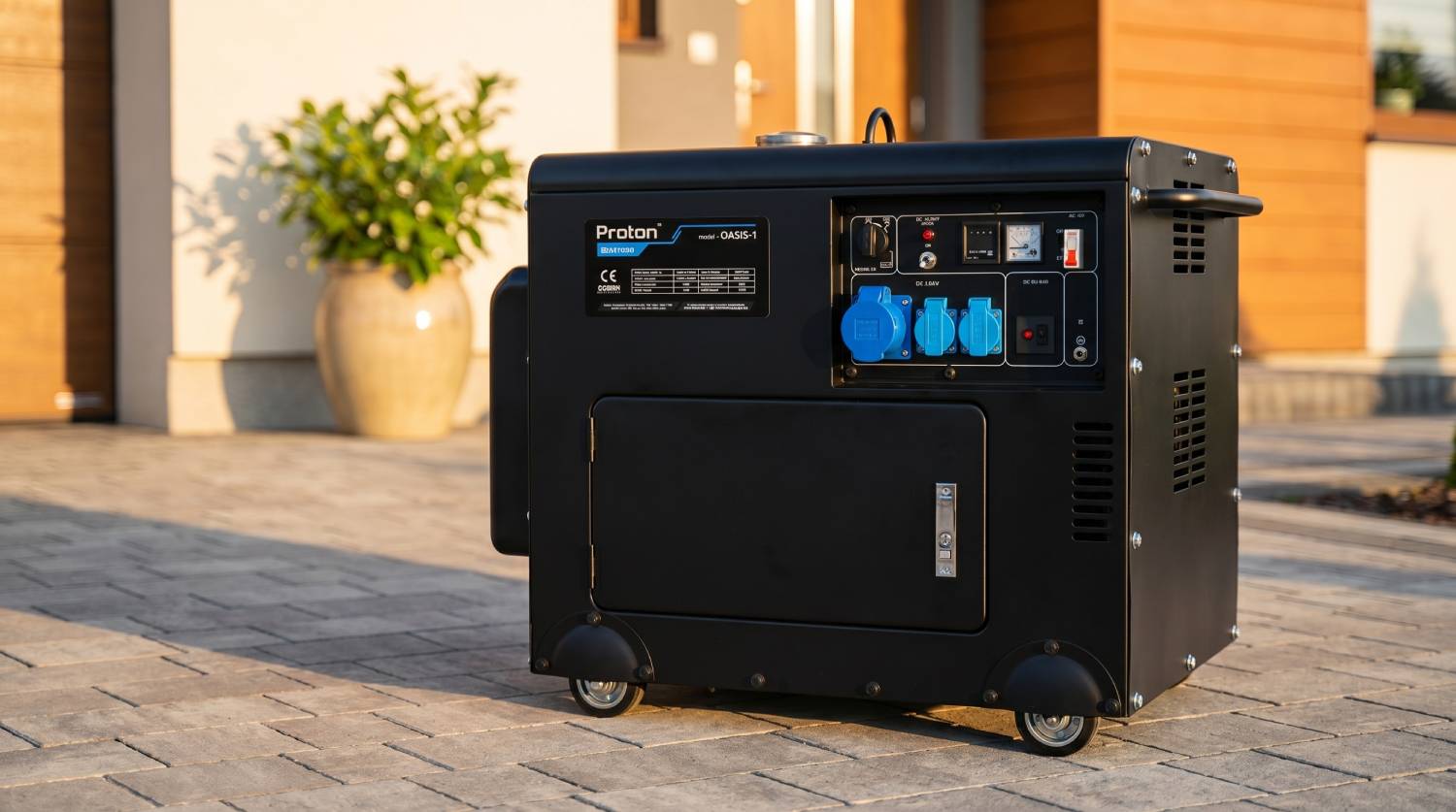 Przykładem takiego urządzenia jest Proton Oasis 1 Diesel polskiego producenta Proton Polska – jednofazowy agregat o mocy 7 kW w wyciszonej obudowie, z regulatorem AVR i zużyciem paliwa na poziomie 1,2 l/h przy 90% obciążenia: https://proton-polska.pl/product-pol-496-Agregat-pradotworczy-do-domu-Proton-Oasis-1.html