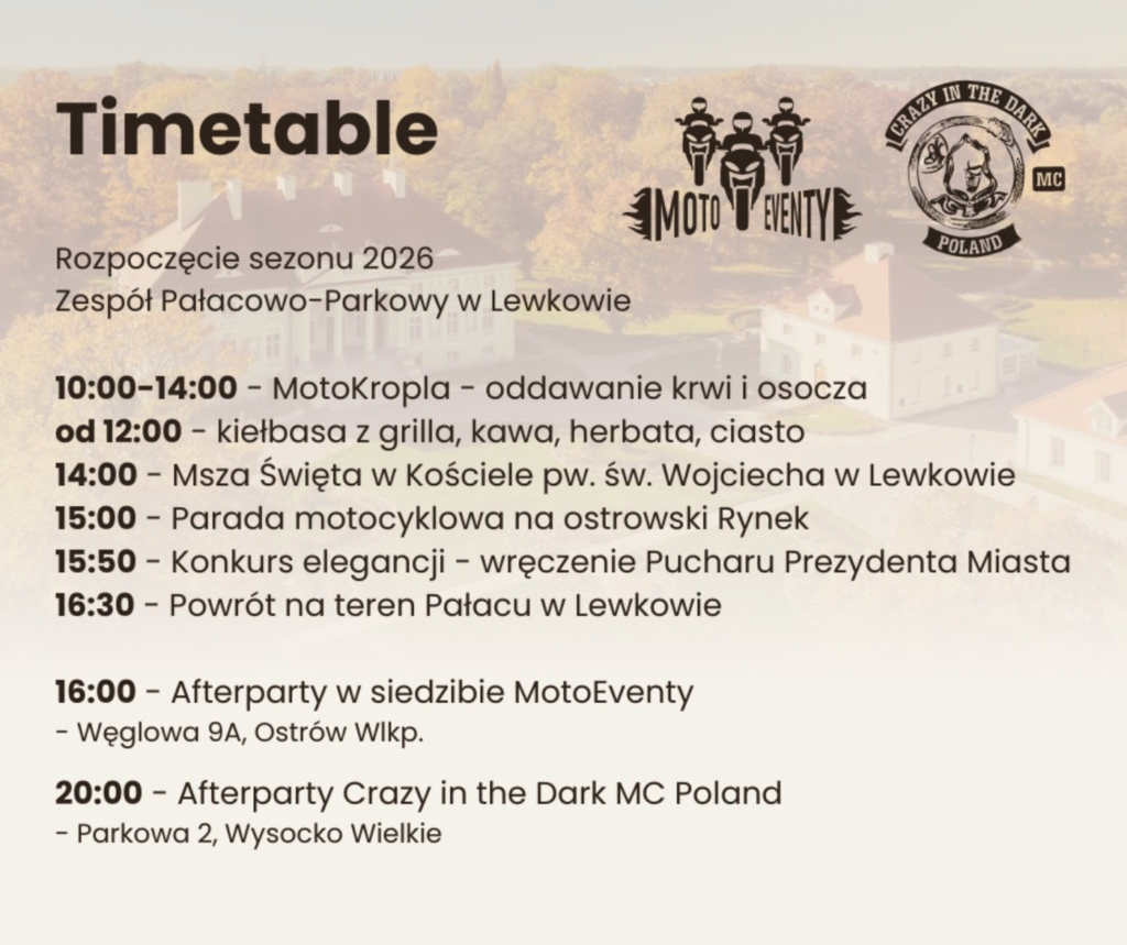 O godzinie 13:00 rozpocznie się msza święta, która odbędzie się kościele pw. św. Wojciecha w Lewkowie. – Następnie odbędzie się parada ulicami Ostrowa, aż na rynek. Tam odbędzie się wybór najlepszego motocykla. Zapraszamy wszystkich: ludzi w samochodach, pieszo, na rowerach, rolkach – niech będzie jak największa rzesza ludzi – dodaje Michał Wieczorkiewicz.