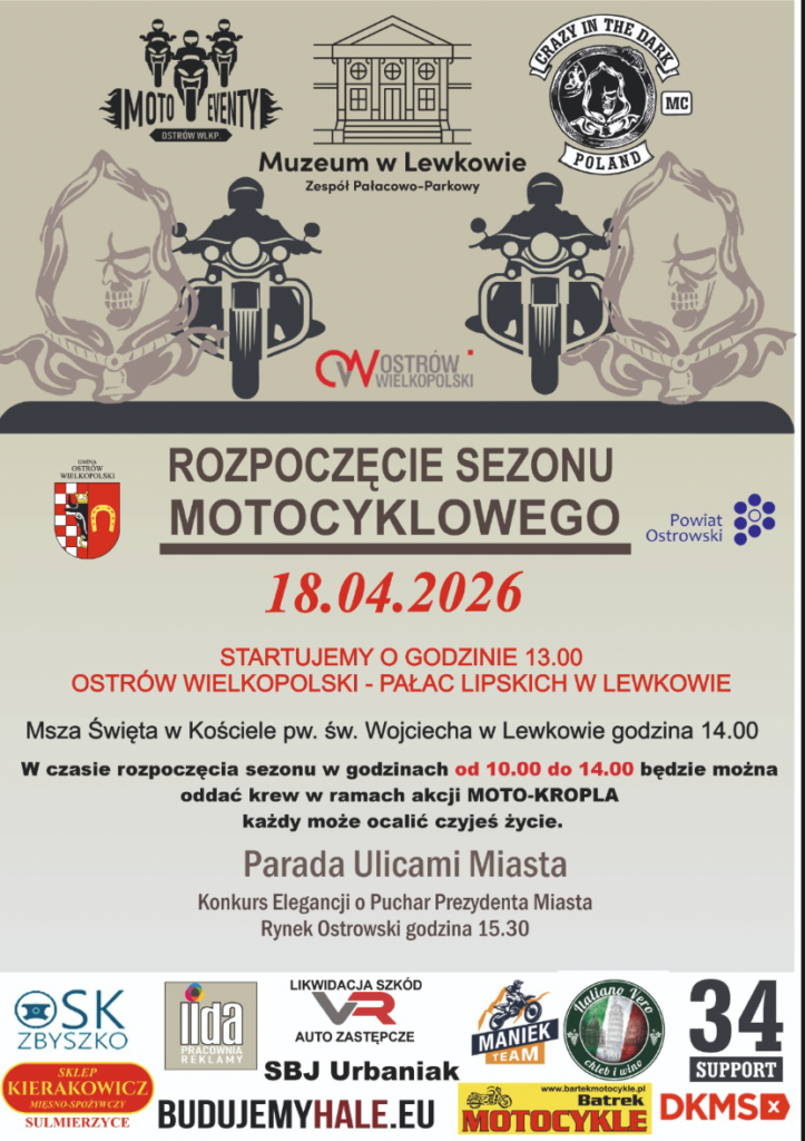 Otwarcie sezonu motocyklowego to coś, na co czekają właściciele ale również pasjonaci dwóch kółek. To dzień, gdy na ostrowskie drogi wyjeżdża parada motocykli, by uroczyście powitać sezon. W tym roku wydarzenie ma zmienioną lokalizację. Akcja poboru krwi, poczęstunek oraz różnego rodzaju atrakcje będą odbywać się na terenie Zespołu Pałacowo-Parkowego w Lewkowie. – Moto-kropla rozpoczyna się już o godzinie 9:00 i potrwa do 14:00 lub do ostatniego pacjenta. Nowością jest także możliwość zapisania się w bazie DKMS także zapraszamy wszystkich chętnych – mówi Mariusz Pawlak, motocyklista oraz współorganizator wydarzenia. O godzinie 12:00 będzie miał miejsce poczęstunek w postaci ciasta oraz kawy lub herbaty.