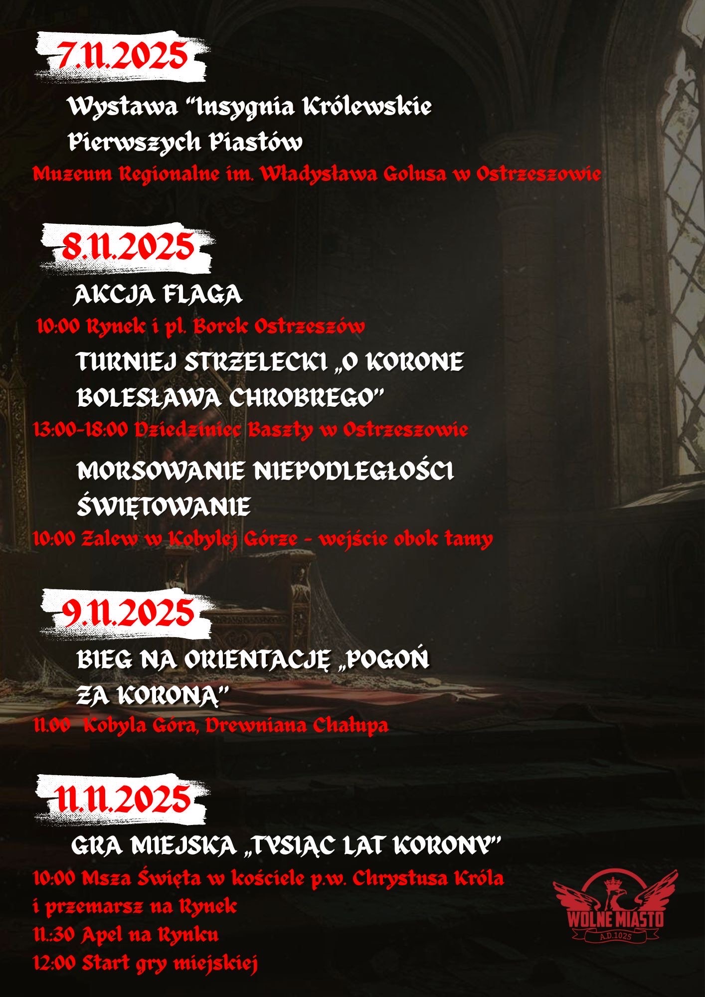 Na święto odzyskania przez Polskę niepodległości, a więc na 11 listopada, przewidziano grę miejską „Tysiąc lat korony”. Ma to być patriotyczna zabawa poprzedzona mszą św. oraz apelem na Rynku. Następnie uczestnicy będą mieli do rozwiązania kilka zagadek i do wykonania kilka zadań związanych z historią Polski.