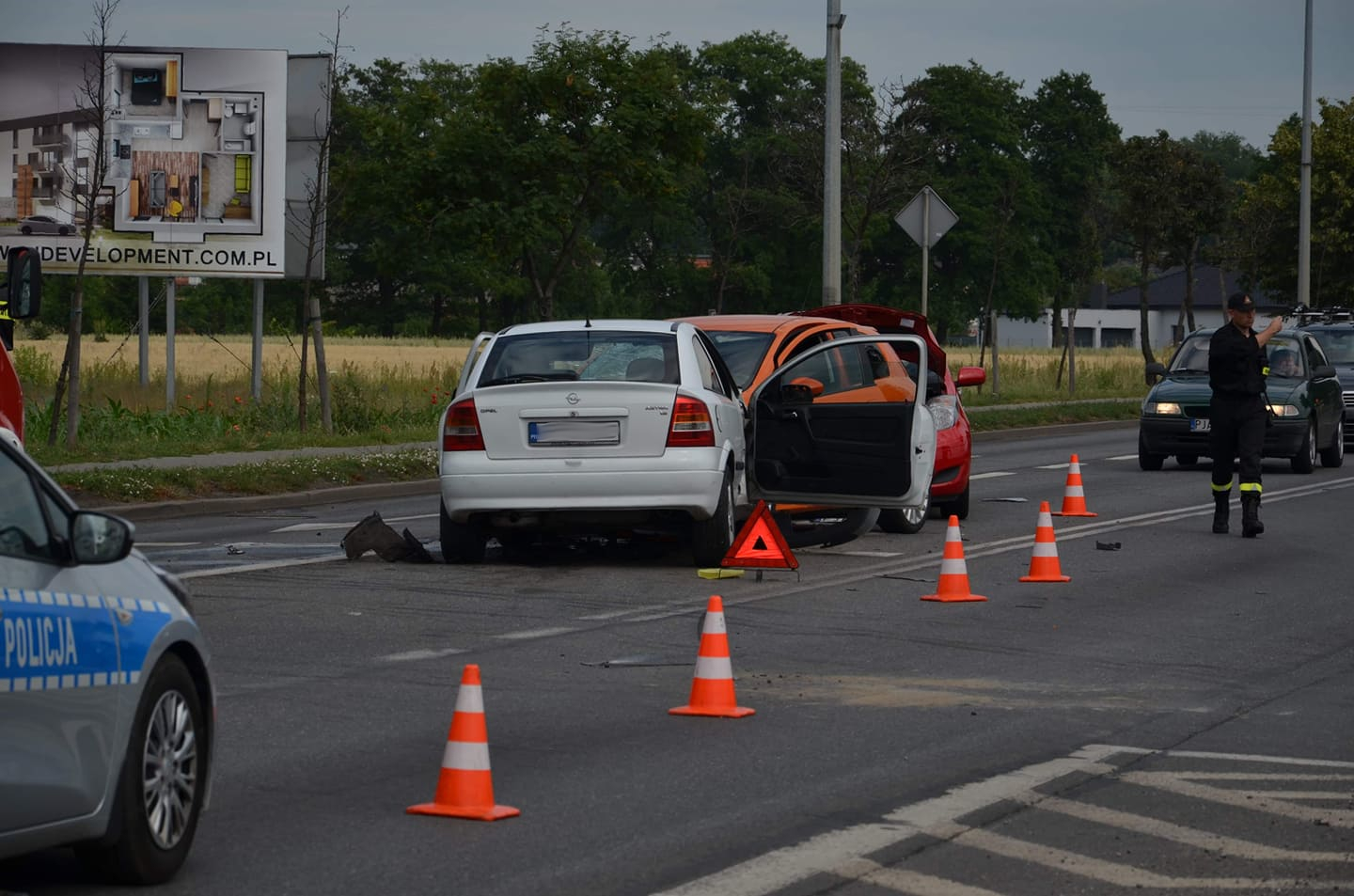 Na miejsce wezwano pogotowie ratunkowe, policję i straż pożarną. Dziecko oraz osobę dorosłą przewieziono na dodatkowe badania do jarocińskiego szpitala. Ruch odbywał się z utrudnieniami, aż do uprzątnięcia pojazdów i usunięcia płynów oraz połamanych części aut.