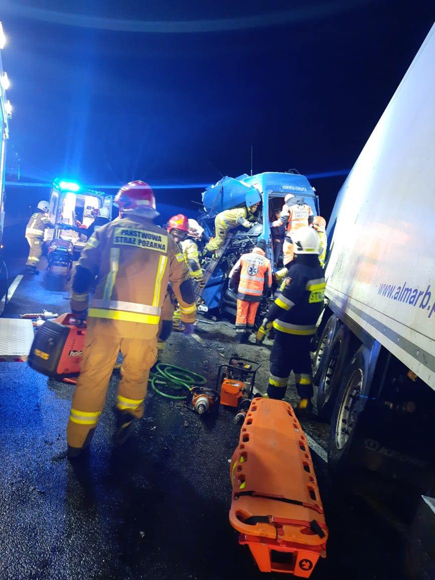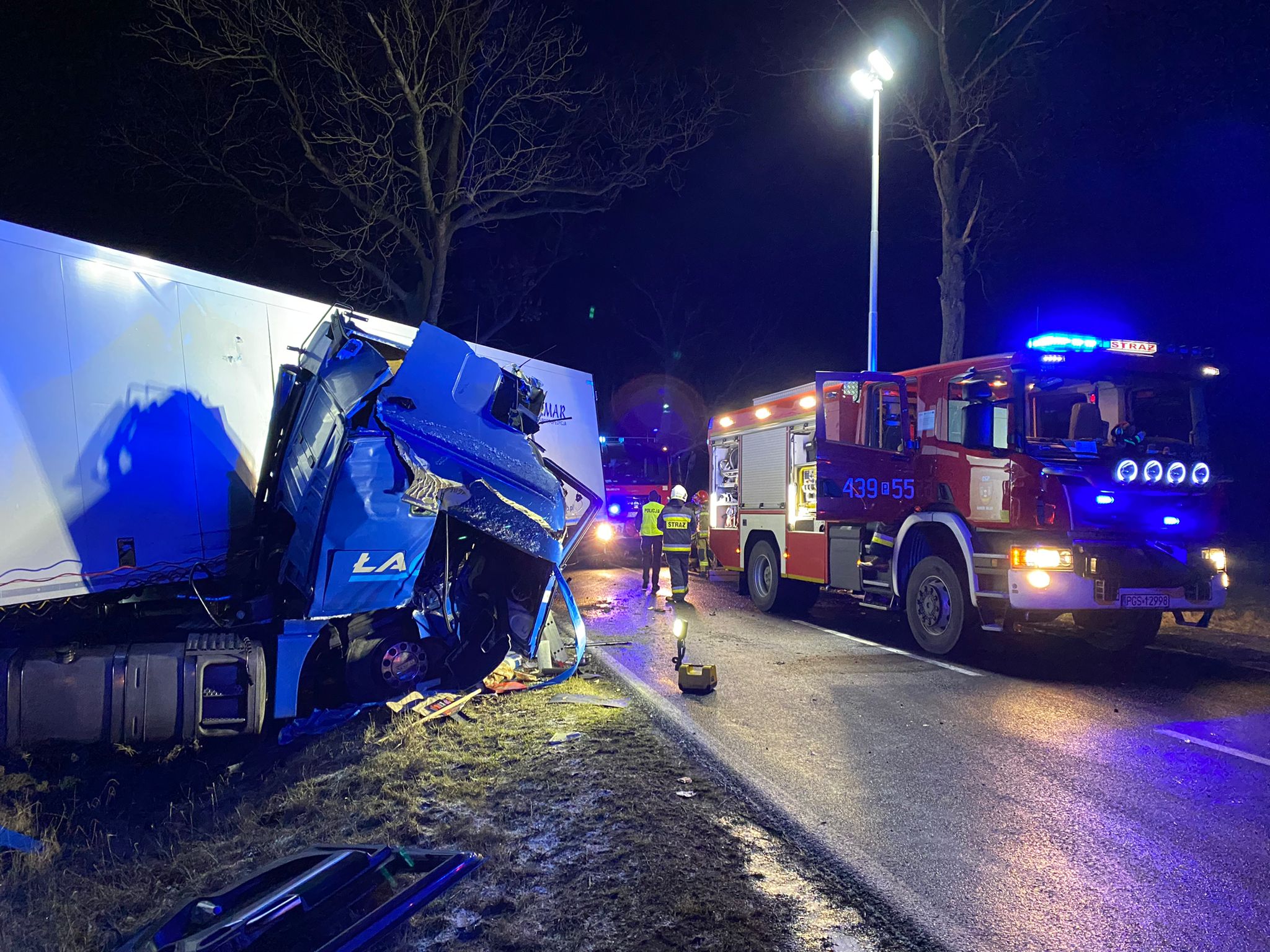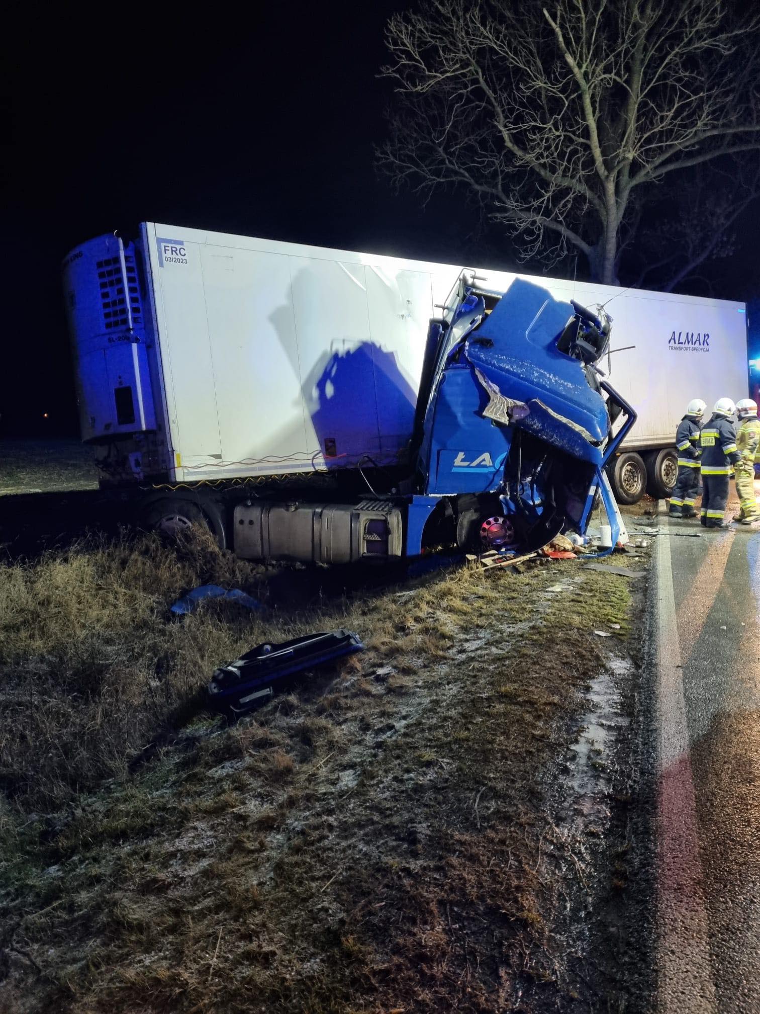 Do wypadku doszło około godziny 2.00 w nocy na drodze wojewódzkiej nr 437. Kierowca samochodu ciężarowego uderzył w drzewo. Na miejscu pojawiły się służby ratunkowe, a ze zgłoszenia wynikało, że kierowca jest zakleszczony w kabinie pojazdu. – Po dojeździe na miejsce, zastano dość mocno zniszczony pojazd, w którym znajdował się przytomny kierowca. Strażacy przy użyciu narzędzi hydraulicznych, wykonali dostęp do kierowcy ciężarówki. Następnie, przy pomocy ratowników, poszkodowany opuścił pojazd. Załoga ZRM podjęła decyzję o zabraniu kierowcy pojazdu do szpitala na dodatkowe badania – poinformował kpt. Marcin Nyczka z Komendy Powiatowej PSP w Gostyniu.