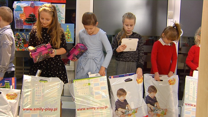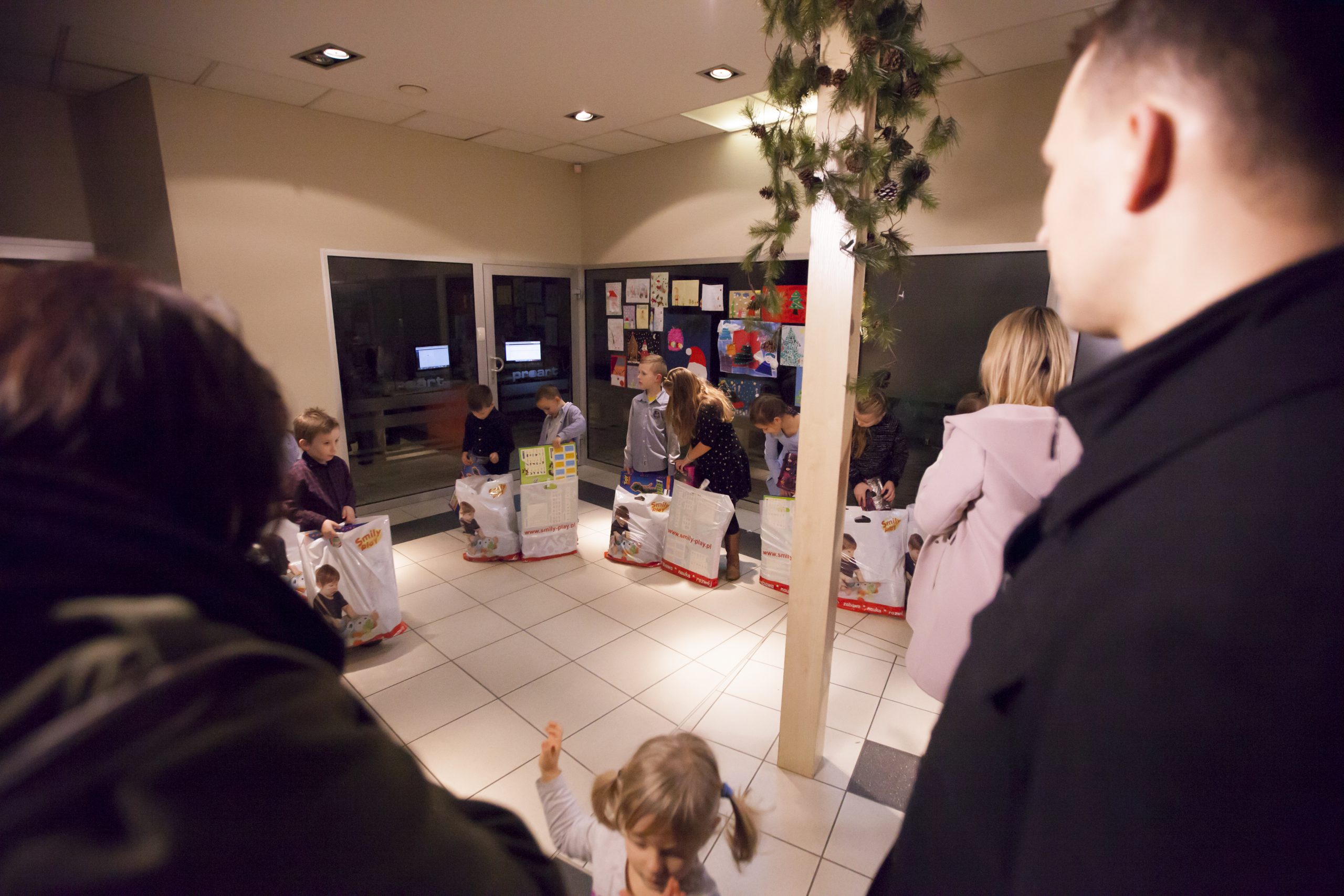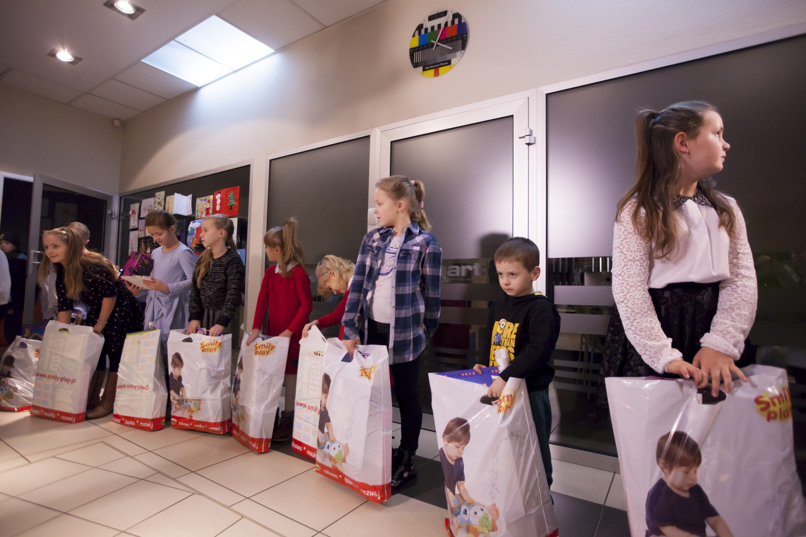 „Święty Mikołaj” miał jednak ograniczony budżet 🙂 dlatego nagrodził dwadzieścia najlepszych prac. Dziś w siedzibie telewizji Proart mali widzowie wraz z rodzicami odebrali torby z podarunkami.
