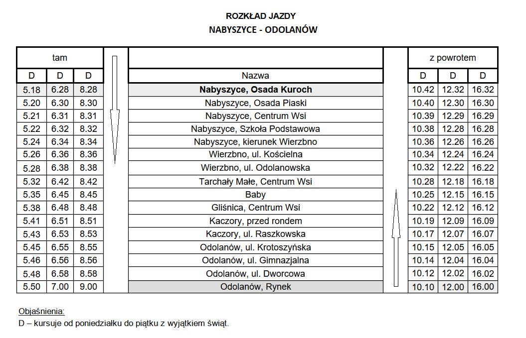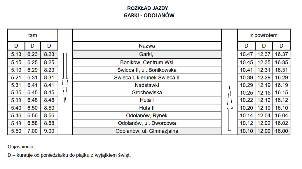 Na początek uruchomiono dwie linie autobusowe, obsługujące miejscowości położone na terenie gminy. Szczegółowe trasy oraz rozkład jazdy dostępne są w zamieszczonej poniżej tabeli.