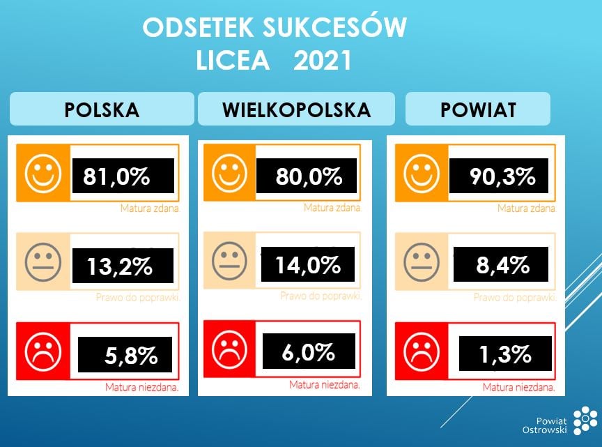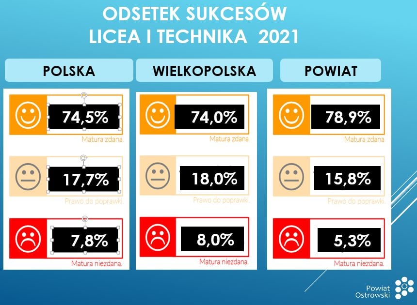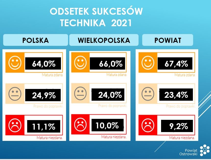 Dziś maturzyści odebrali wyniki. Jeśli chodzi o technika w Wielkopolsce maturę zdano na poziomie 80%, a w powiecie ostrowskim na poziomie 90,3%. Jeśli chodzi o uczniów technikum w Wielkopolsce osiągnięto wynik 66%, a w powiecie ostrowskim 67,4%.