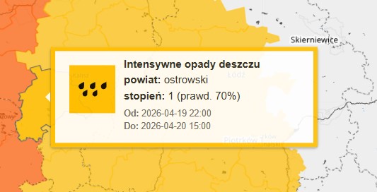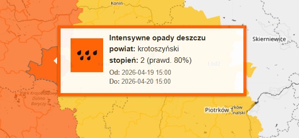Pomarańczowe ostrzeżenie (II stopnia) wydano dla powiatu krotoszyńskiego oraz jarocińskiego i obowiązuje od godziny 15:00 w niedzielę do godziny 15:00 w poniedziałek: „Prognozowane są opady deszczu o natężeniu umiarkowanym, okresami silnym. Prognozowana wysokość opadów od 40 mm do 50 mm, lokalnie do 60 mm. Lokalnie możliwe burze. Najsilniejsze opady prognozowane są na niedzielny wieczór oraz na noc z niedzieli na poniedziałek” – alarmuje IMGW.