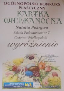 Organizatorem przedsięwzięcia było Młodzieżowe Centrum Kultury w Legnicy. Zadaniem uczestników było zaprojektowanie i wykonanie kartki świątecznej, która w sposób oryginalny zobrazuje zwyczaje i tradycje Świąt Wielkanocnych. Jedenastoletnia Natalia namalowała liturgiczny symbol Wielkanocy, jakim jest baranek z czerwoną chorągwią, klęczący przy biblii, symbol męczeńskiej śmierci i zmartwychwstania Chrystusa oraz Eucharystii. Młoda artystka uzyskała wyjątkowe efekty malarskie poprzez swobodne łączenie technik malarskich oraz umiejętności w zakresie kompozycji, perspektywy, koloru i światłocienia. Po raz kolejny uczennica „Siódemki” odniosła ogólnopolski sukces plastyczny promując swoją szkołę i miasto. Swoje umiejetności artystyczne od pięciu lat szlifuje pod kierunkiem nauczycielki plastyki Violetty Lebdy.