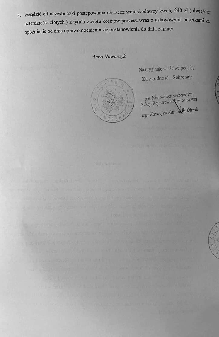 Zasądzić od uczestniczki postępowania na rzecz wnioskodawcy kwotę 240 złotych z tytułu zwrotu kosztów procesu wraz z ustawowymi odsetkami za opóźnienie od dnia uprawomocnienia się postanowienia do dnia zapłaty.*