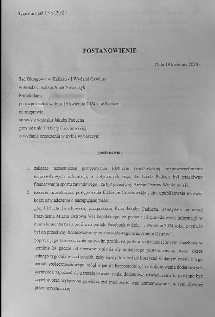 Proces dotyczył komentarzy na Facebooku, które miała umieścić Elżbieta Grochowska. W ich treści miała napisać, że Jakub Paduch był przeciwny budowie Areny Ostrów. Dziś Sąd Okręgowy w Kaliszu wydał postanowienie w trybie wyborczym. Oto treść postanowienia:
