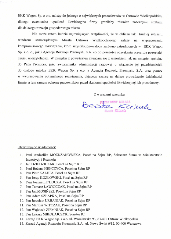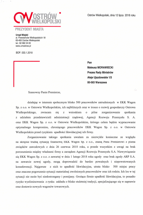 EKK Wagon należy do jednej z największych firm w Ostrowie. „Nie może zatem budzić najmniejszych wątpliwości, że w obliczu tak trudnej sytuacji, władzom samorządowym Miasta Ostrowa Wielkopolskie zależy na wypracowaniu kompromisowego rozwiązania, które satysfakcjonowałoby zarówno zatrudnionych w EKK Wagon, jak i Agencję Rozwoju Przemysłu, co do pewności odzyskania przez nią pozostałej części wierzytelności” – czytamy w piśmie wysłanym przez prezydent Klimek do premiera Morawieckiego.