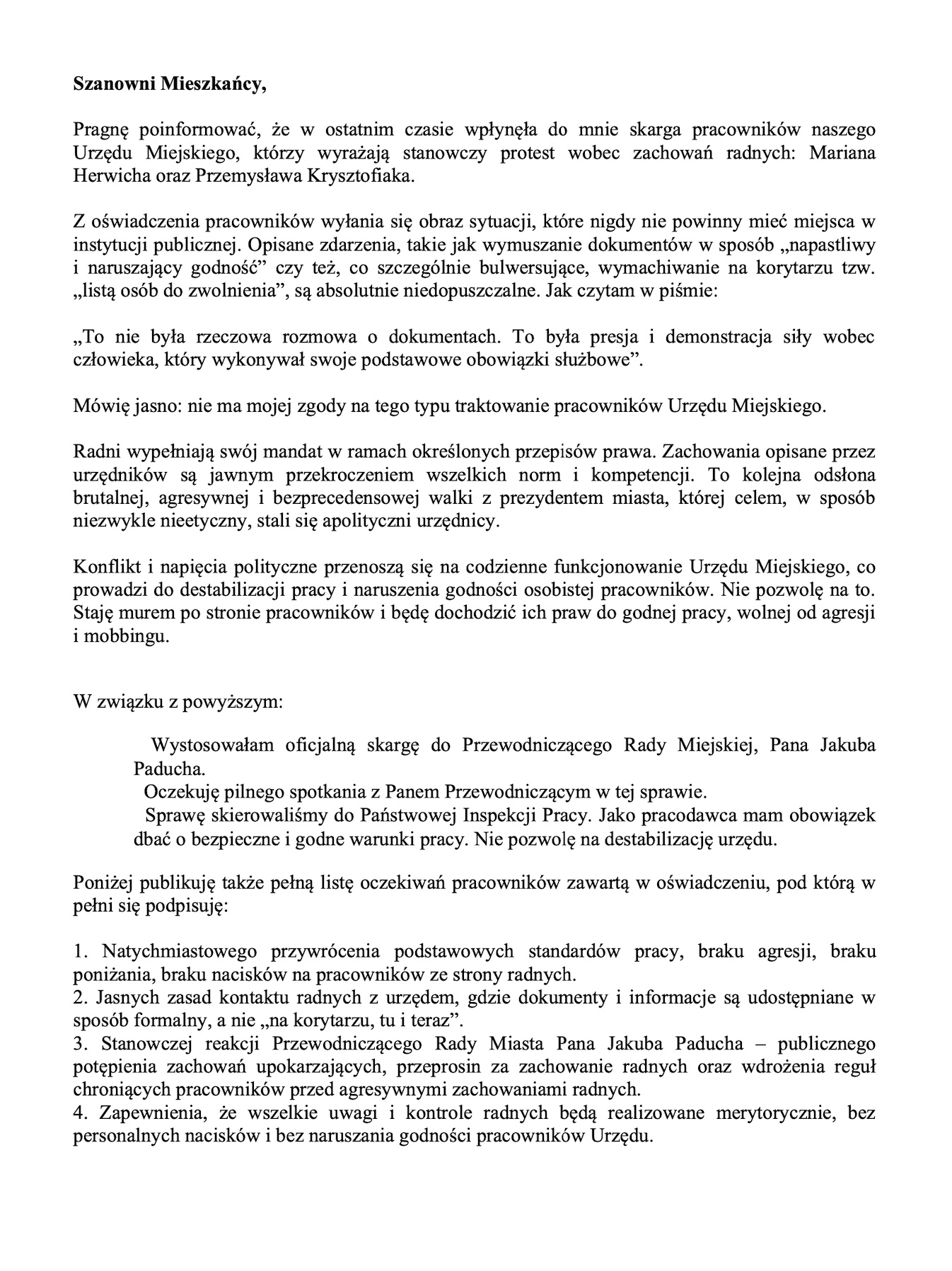 „Mówię jasno: nie ma mojej zgody na tego typu traktowanie pracowników Urzędu Miejskiego”. Zapewnia, że nie zostawi tak tej sprawy i informuje, jakie podejmuje kroki. „Wystosowałam oficjalną skargę do Przewodniczącego Rady Miejskiej, Pana Jakuba Paducha. Oczekuję pilnego spotkania z Panem Przewodniczącym w tej sprawie. Sprawę skierowaliśmy do Państwowej Inspekcji Pracy. Jako pracodawca mam obowiązek dbać o bezpieczne i godne warunki pracy. Nie pozwolę na destabilizację urzędu” – czytamy w oświadczeniu. Poniżej również publikujemy pełną treść oświadczenia.