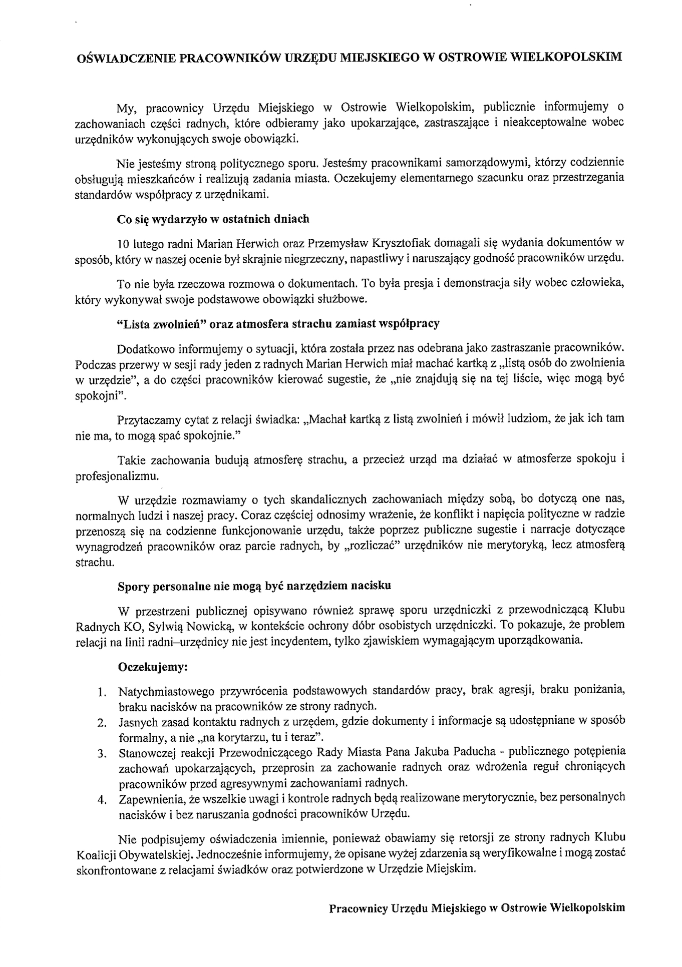 Anonimowe pismo, które nie nosi śladu ręcznego pisma, stawia poważne zarzuty wobec dwóch radnych – Mariana Herwicha i Przemysława Krysztofiaka. Czytamy w nim o tym, że 10 lutego br. miało dojść do konfrontacji między bliżej nieokreślonymi w piśmie urzędnikami a wspomnianymi radnymi, którzy „domagali się wydania dokumentów w sposób, który w naszej ocenie był skrajnie niegrzeczny, napastliwy i naruszający godność pracowników urzędu” – czytamy w piśmie. Dalej mowa o „presji i demonstracji siły wobec człowieka, który wykonywał swoje podstawowe obowiązki służbowe” oraz o rzekomej „liście osób do zwolnienia”, którą jeden z radnych miał „wymachiwać”.