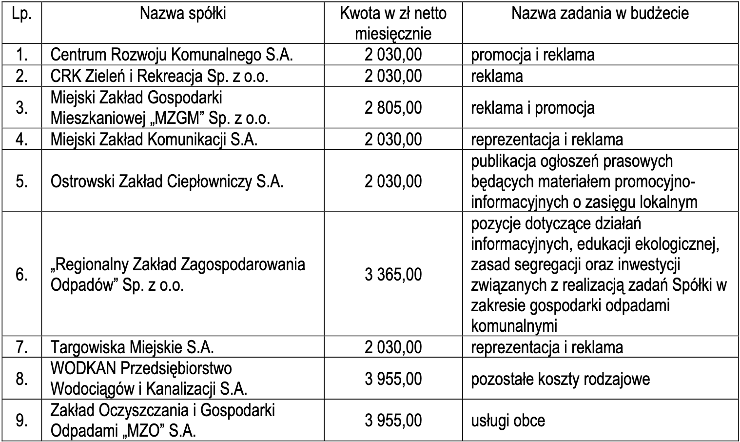Odpowiedzi na jego styczniową interpelację udzielił wiceprezydent Sebastian Górski, który załączył tabelę z wykazem kwot netto miesięcznie, jakie przekazują na ten cel miejskie instytucje (poniżej):