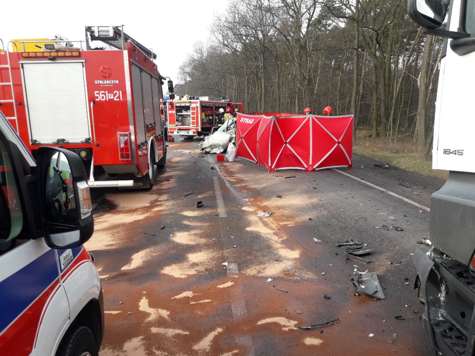 Śmiertelny wypadek w Piekarzewie. Zderzyły się dwa TIR-y i osobówka [ZDJĘCIA]