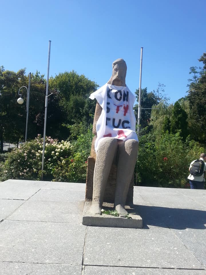 KOD krzyczy o poszanowaniu konstytucji, a widać po zachowaniu tych ludzi, że nie mają poszanowania dla prawa i zwykłych ustaw. Skoro to, co robią czyli ubierają pomniki w koszulki z napisem konstytucja jest niezgodne z prawem.