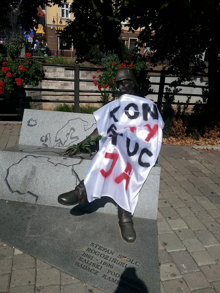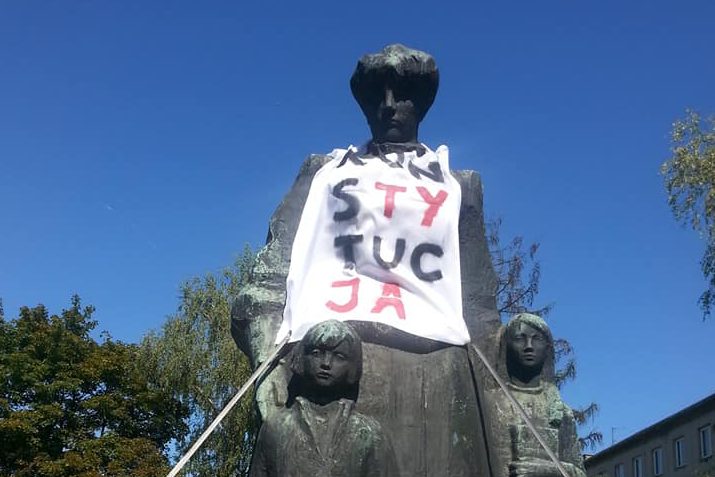 Pomniki częściowo zasłonięte transparentami z napisem „Konstytucja” to częsty widok w ostatnich dniach w wielu miastach Polski. Również w Kaliszu, gdzie takie „koszulki” zostały nałożone na pomniki Adama Asnyka, Marii Konopnickiej, Stefana Szolca-Rogozińskiego, a także mitologicznego Ikara.