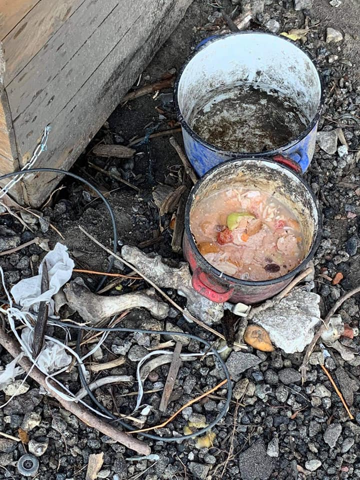 Pies cierpiący, bo z urwaną nogą, śmieciowe jedzenie, pies na łańcuchu (ciekawe czy spuszczany czasami?) …