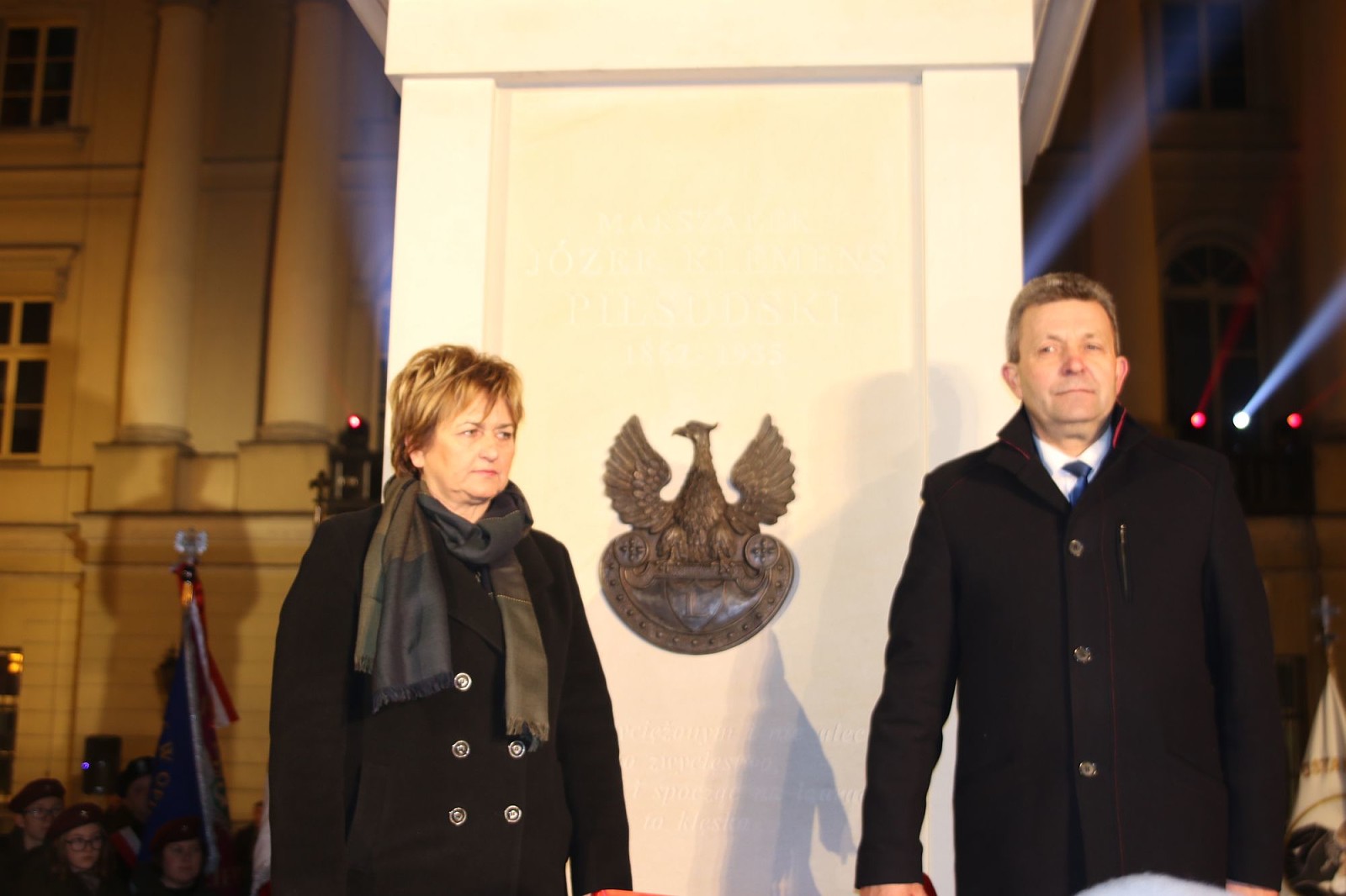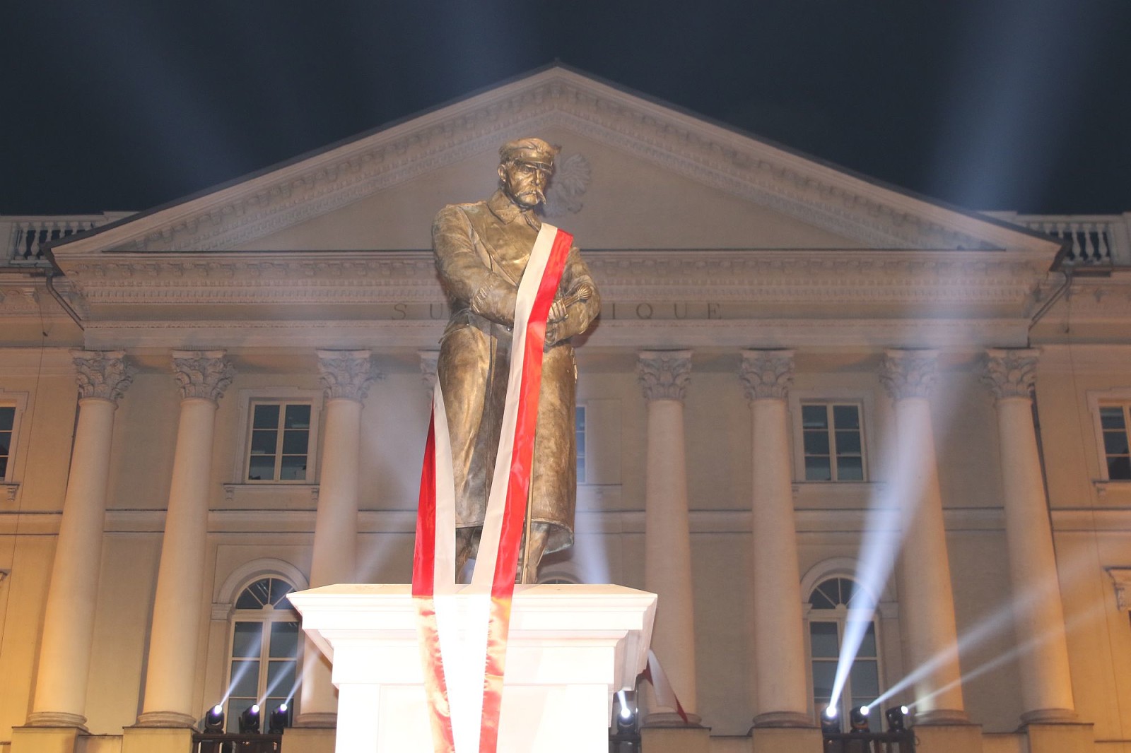 Na kilkumetrowym cokole, na którym ustawiony jest pomnik, napisano: „W 100. rocznicę odzyskania niepodległości Marszałkowi Rodacy”. – Odsłaniany dziś pomnik powstał w odpowiedzi na oczekiwania społeczne. Warto pamiętać, że pomnik stanął w al. Wolności, która do 1939 roku nosiła imię Aleksandry Piłsudskiej. Mam nadzieję, że wpisze się w krajobraz naszego miasta – dodał.