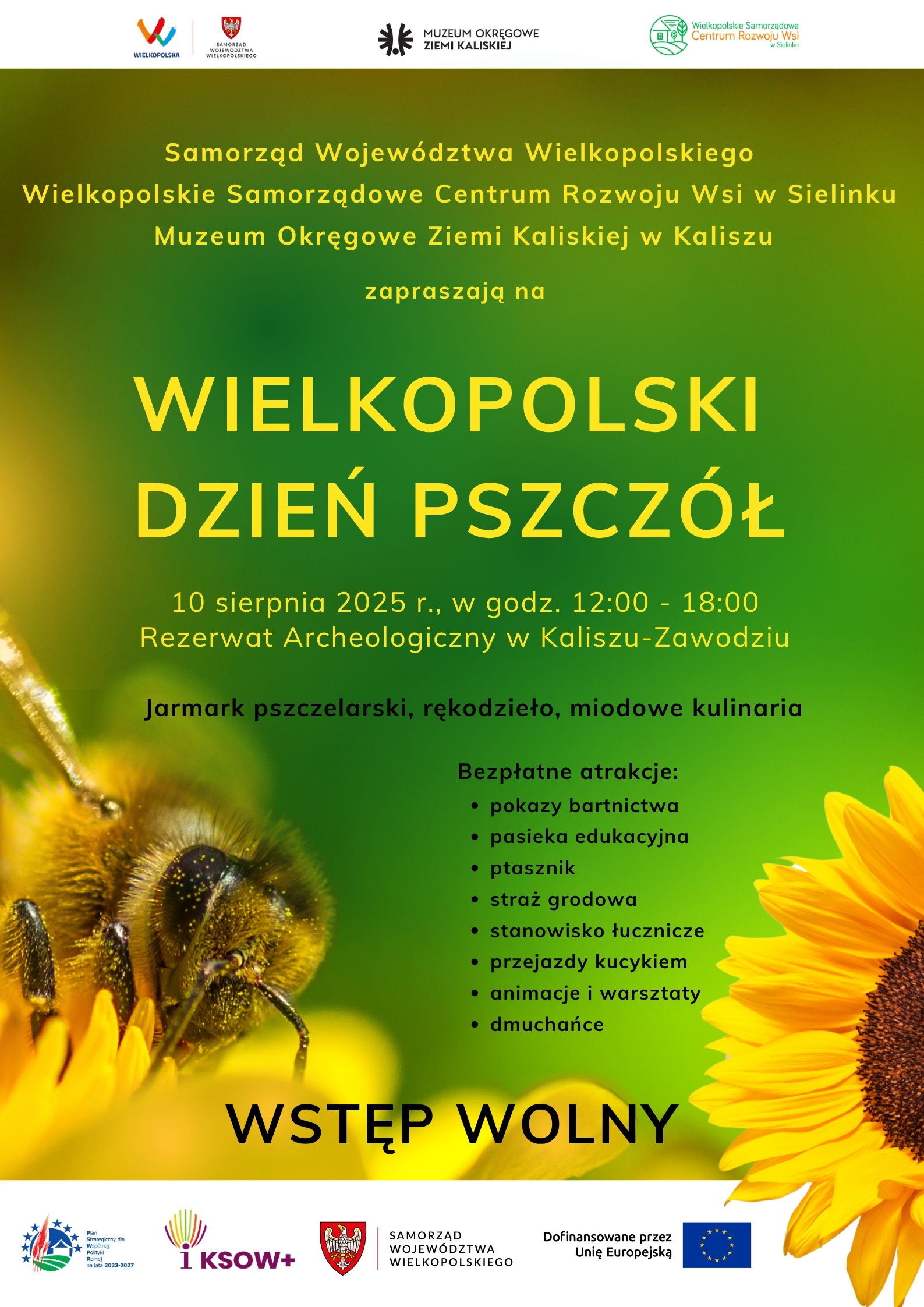 Samorząd Województwa Wielkopolskiego wraz z Wielkopolskim Samorządowym Centrum Rozwoju Wsi w Sielinku oraz Muzeum Okręgowym Ziemi Kaliskiej zapraszają na wielkie wydarzenie plenerowe „Wielkopolski Dzień Pszczół”, którego kolejna edycja odbędzie się