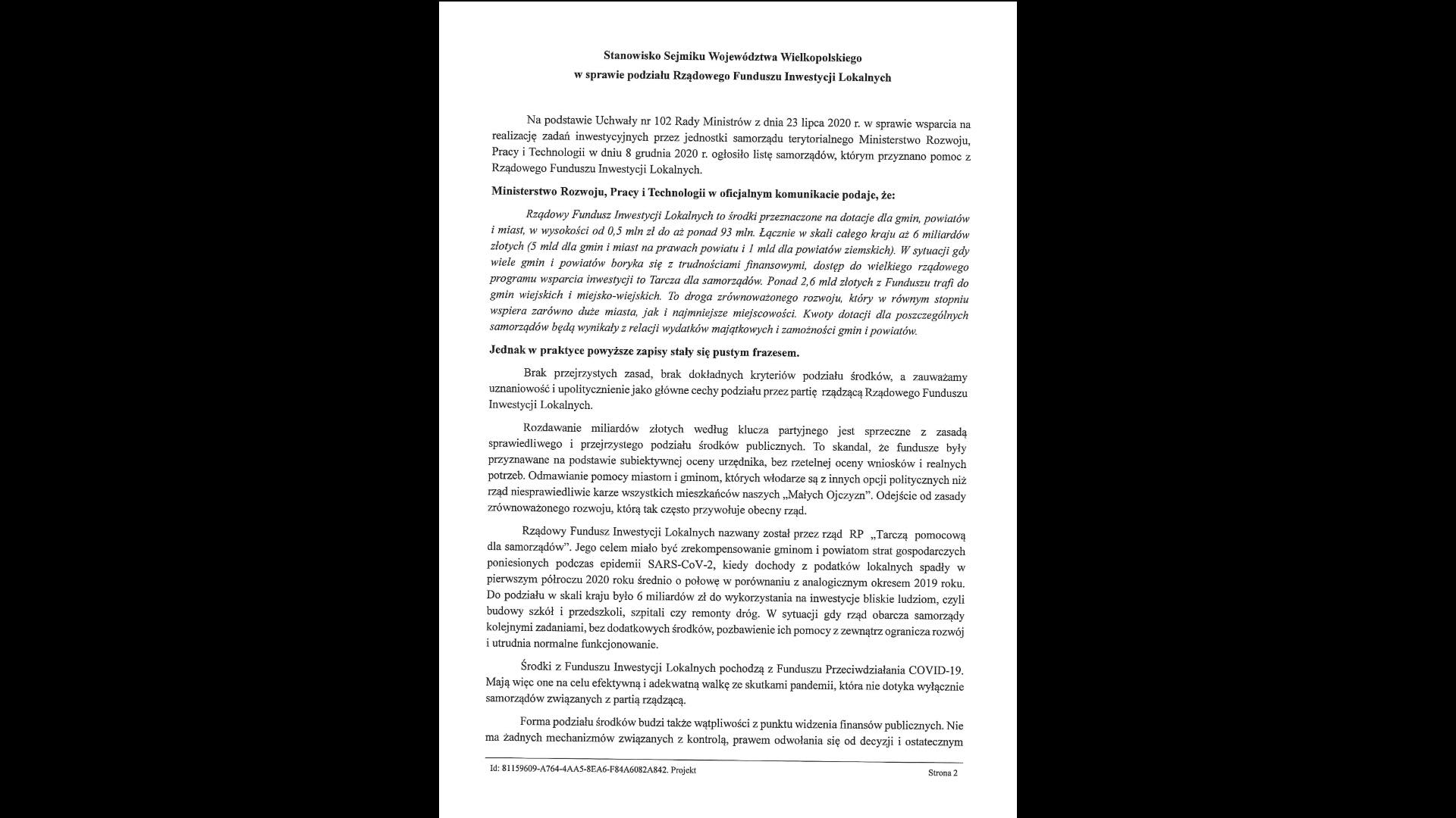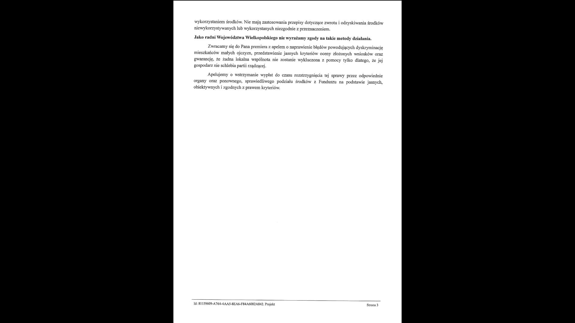 Tym samym radni Województwa Wielkopolskiego nie wyrazili zgody na takie metody działania. Zwrócili się także do premiera Mateusza Morawieckiego o „naprawienie błędów powodujących dyskryminację mieszkańców małych ojczyzn, przedstawienie jasnych kryteriów oceny złożonych wniosków oraz gwarancję, że żadna lokalna wspólnota nie zostanie wykluczona z pomocy tylko dlatego, że jej gospodarz nie schlebia partii rządzącej”.