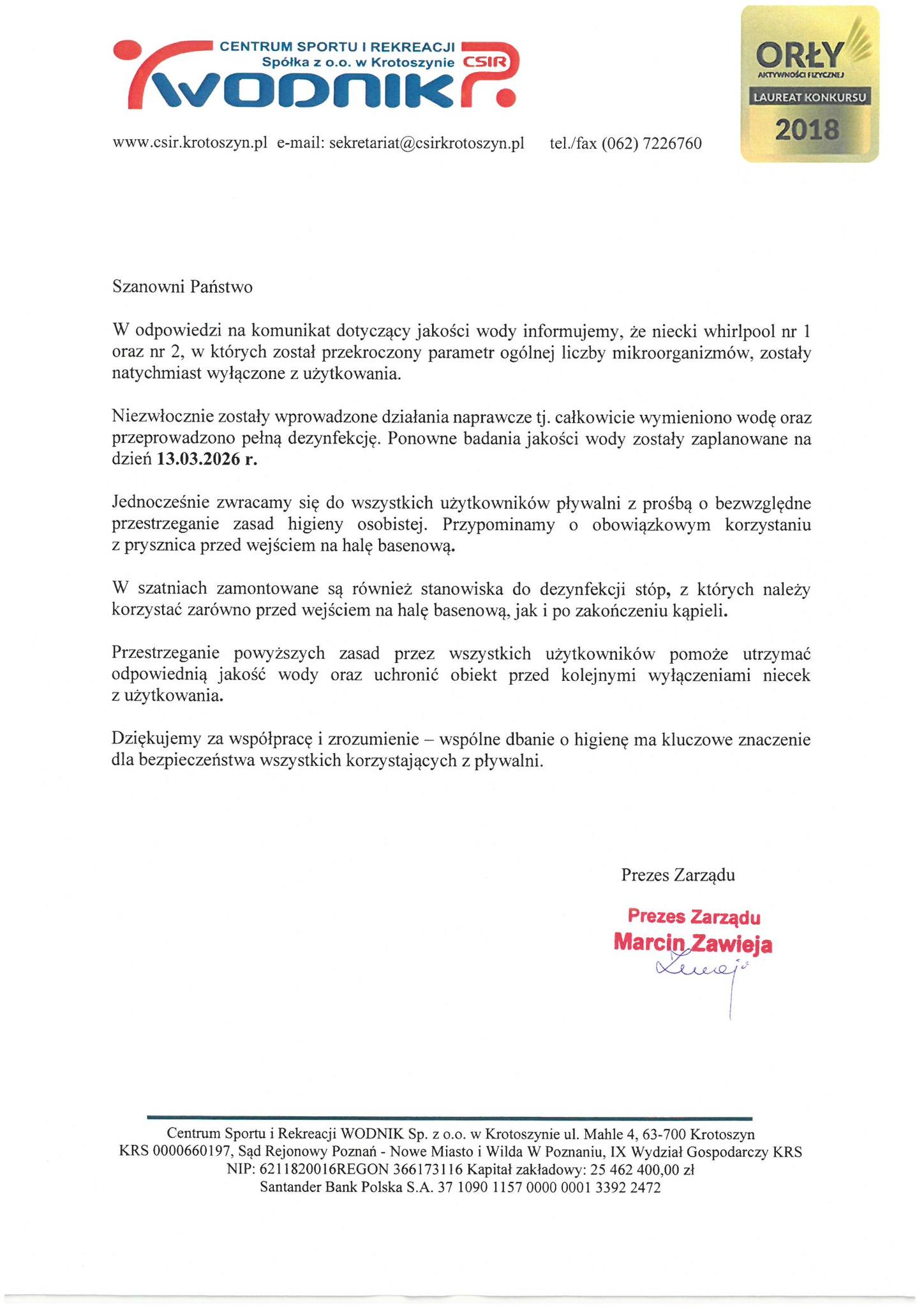 W czwartkowe popołudnie Centrum Sportu i Rekreacji „Wodnik” w Krotoszynie wydało komunikat, w którym przekazało m.in. te informacje, które już wcześniej podaliśmy (akapity wyżej). Dodatkowo prezes zarządu Marcin Zawieja zaapelował do użytkowników obiektu: „Zwracamy się do wszystkich użytkowników pływalni z prośbą o bezwzględne przestrzeganie zasad higieny osobistej. Przypominamy o obowiązkowym korzystaniu z prysznica przed wejściem na halę basenową”.