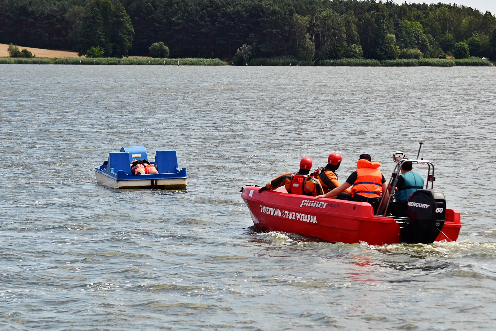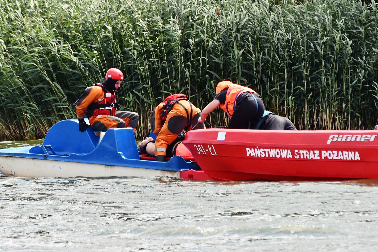 Zasłabnięcie osoby pływającej na rowerku wodnym, wypadnięcie osoby z łodzi i podejrzenie urazu kręgosłupa po skoku na główkę. To trzy scenariusze, które przećwiczyli strażacy, policjanci i ratownicy wodni z powiatu kaliskiego na Jeziorze Pokrzywnickim (tzw. Zbiornik Szałe).