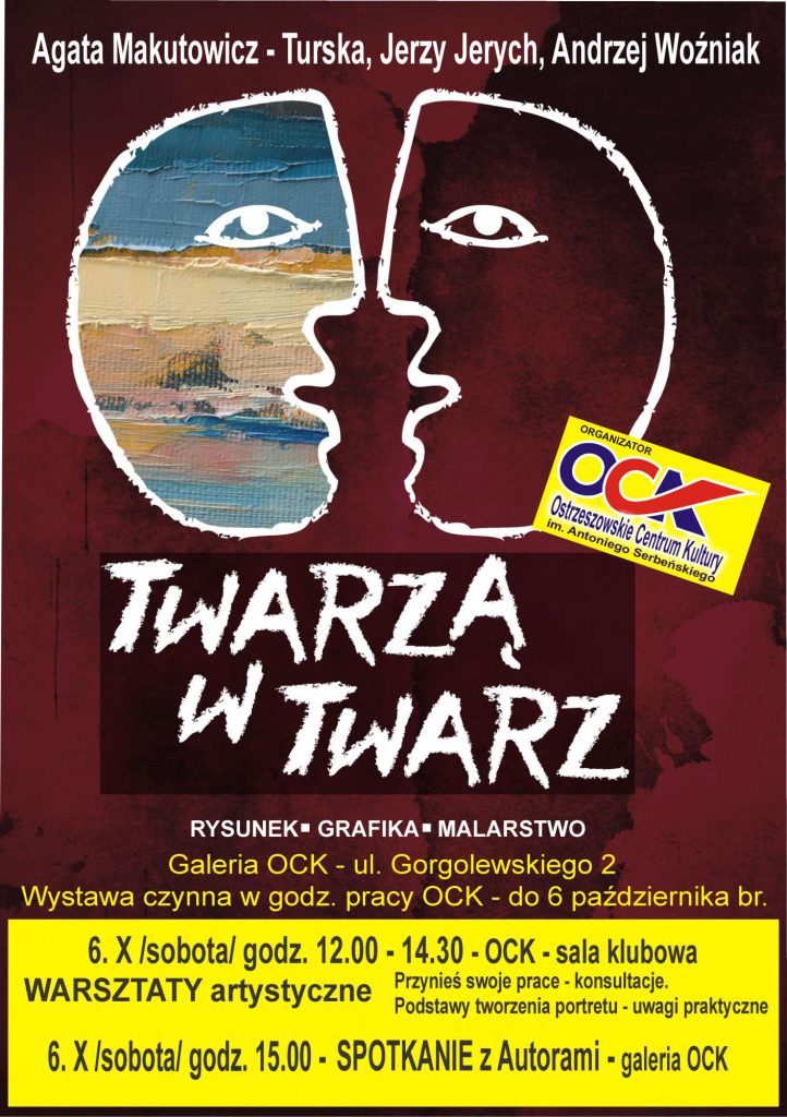Wystawa portretów autorstwa : Agaty Makutynowicz-Turskiej, Jerzego Jerycha i Andrzeja Woźniaka – wieloletnich opiekunów plenerów im. A. Serbeńskiego w Ostrzeszowie.W dniu 6 października warsztaty artystyczne oraz spotkanie z autorami. Przynieś swoje prace – konsultacje. Podstawy tworzenia portretu – uwagi praktyczne, rysowanie, malowanie pod okiem artystów. Proszę zabrać ze sobą materiały w których tworzycie, Zapraszamy dzieci, młodzież i dorosłych.