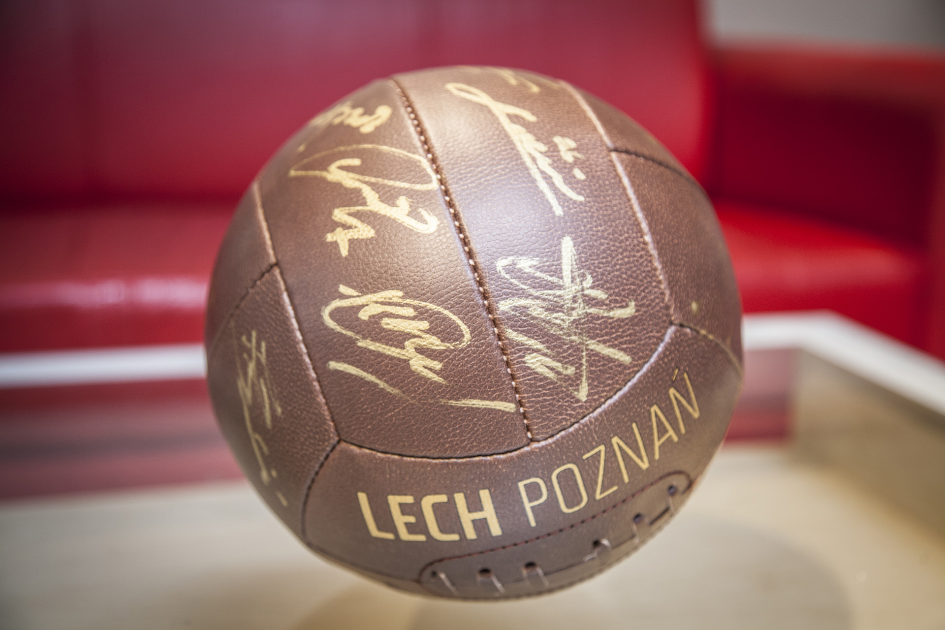Piłka retro Lecha Poznań z podpisami całego zespołu z sezonu 2017/18 przekazana przez organizatorów Turnieju im. Jerzego Kryjoma.