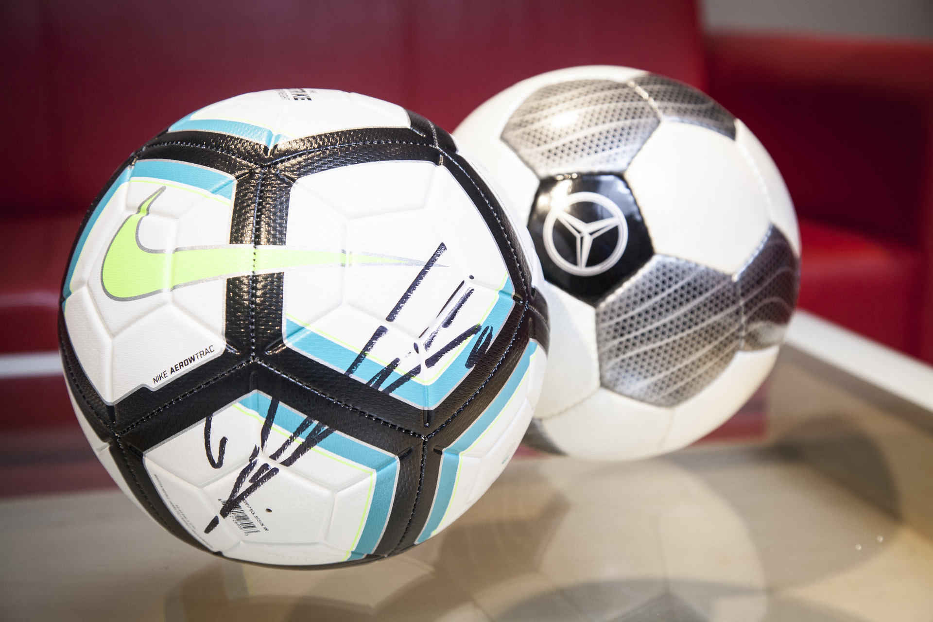 Piłka Nike z podpisem Roberta Lewandowskiego oraz jako bonus piłka z logiem mercedesa przekazana przez Jana i Andrzeja Garcarków, właścicieli firmy Auto Partner J. i A. Garcarek w Ociążu.
