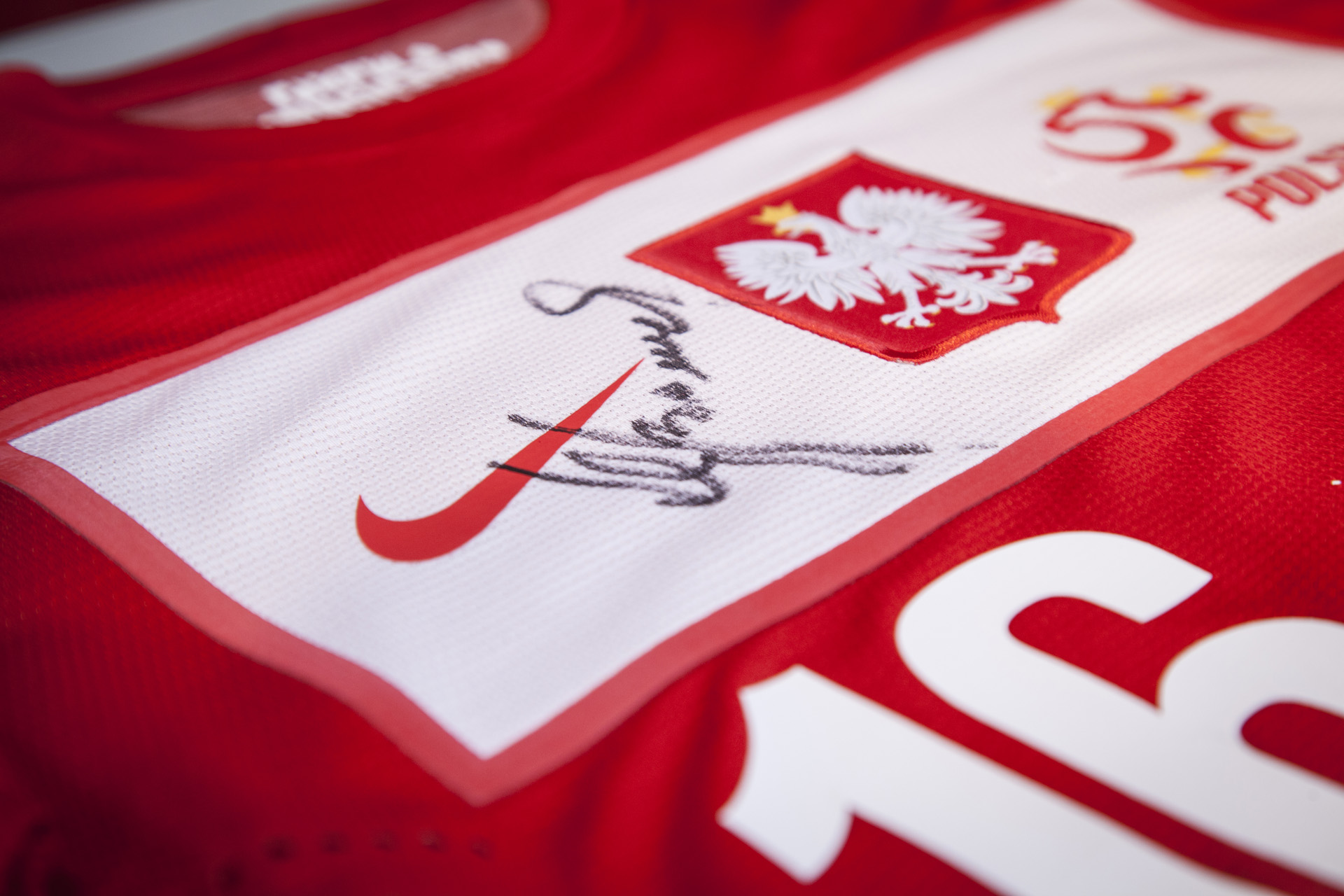 Koszulka reprezentacji Polski z podpisem prezesa Polskiego Związku Piłki Nożnej Zbigniewa Bońka przekazana przez wiceprezesa PZPN-u Andrzeja Padewskiego.