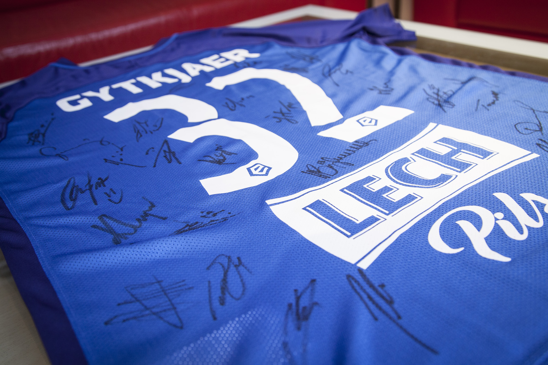Koszulka Christiana Gytkjaer (Lech Poznań) z podpisami całego zespołu (sezon 2017/18) przekazana przez organizatorów turnieju.