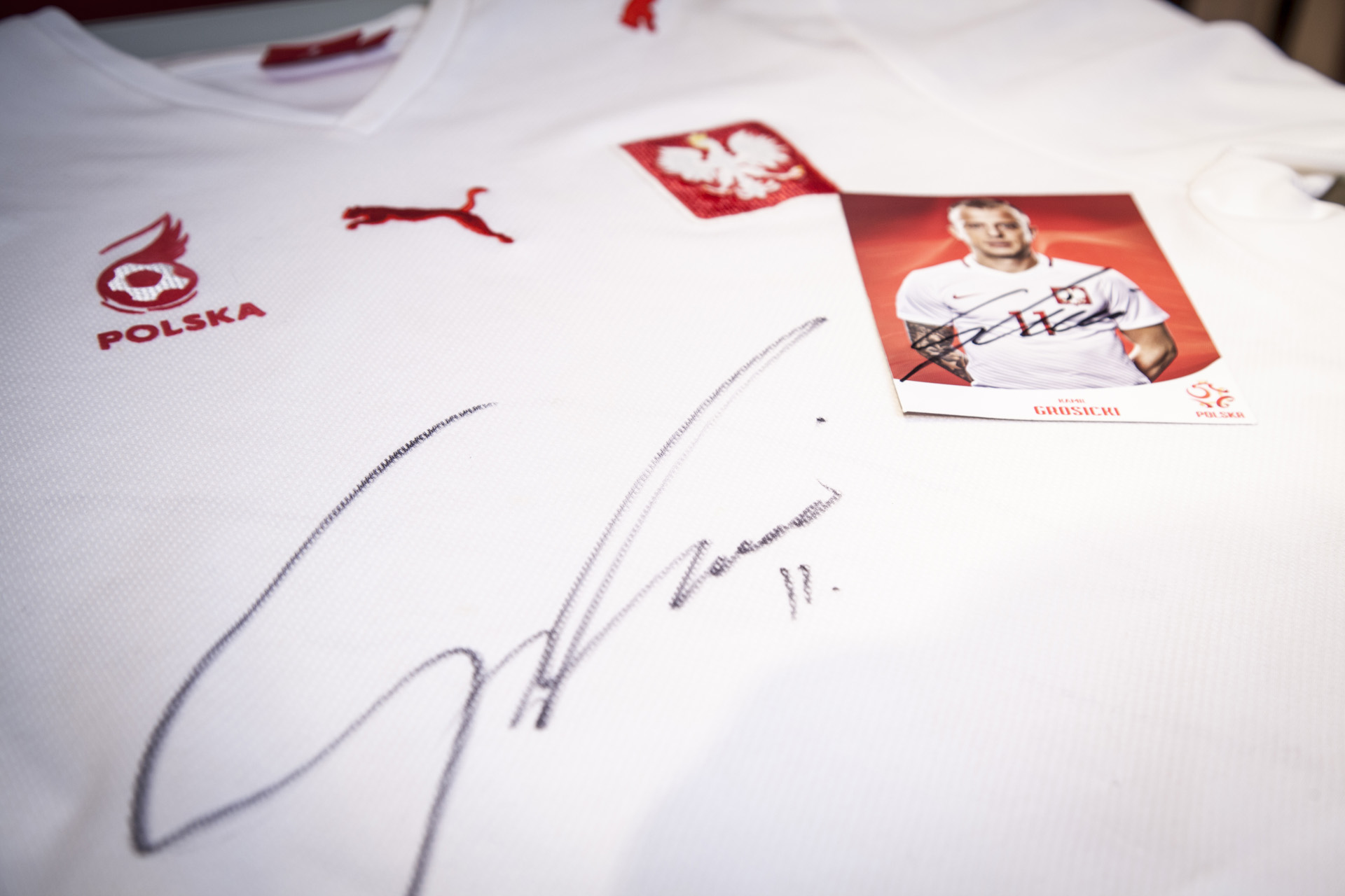 Koszulka reprezentacji Polski z podpisem Kamila Grosickiego oraz fan karta z jego podpisem przekazana przez Marcina Podleckiego z Pogoni Szczecin.