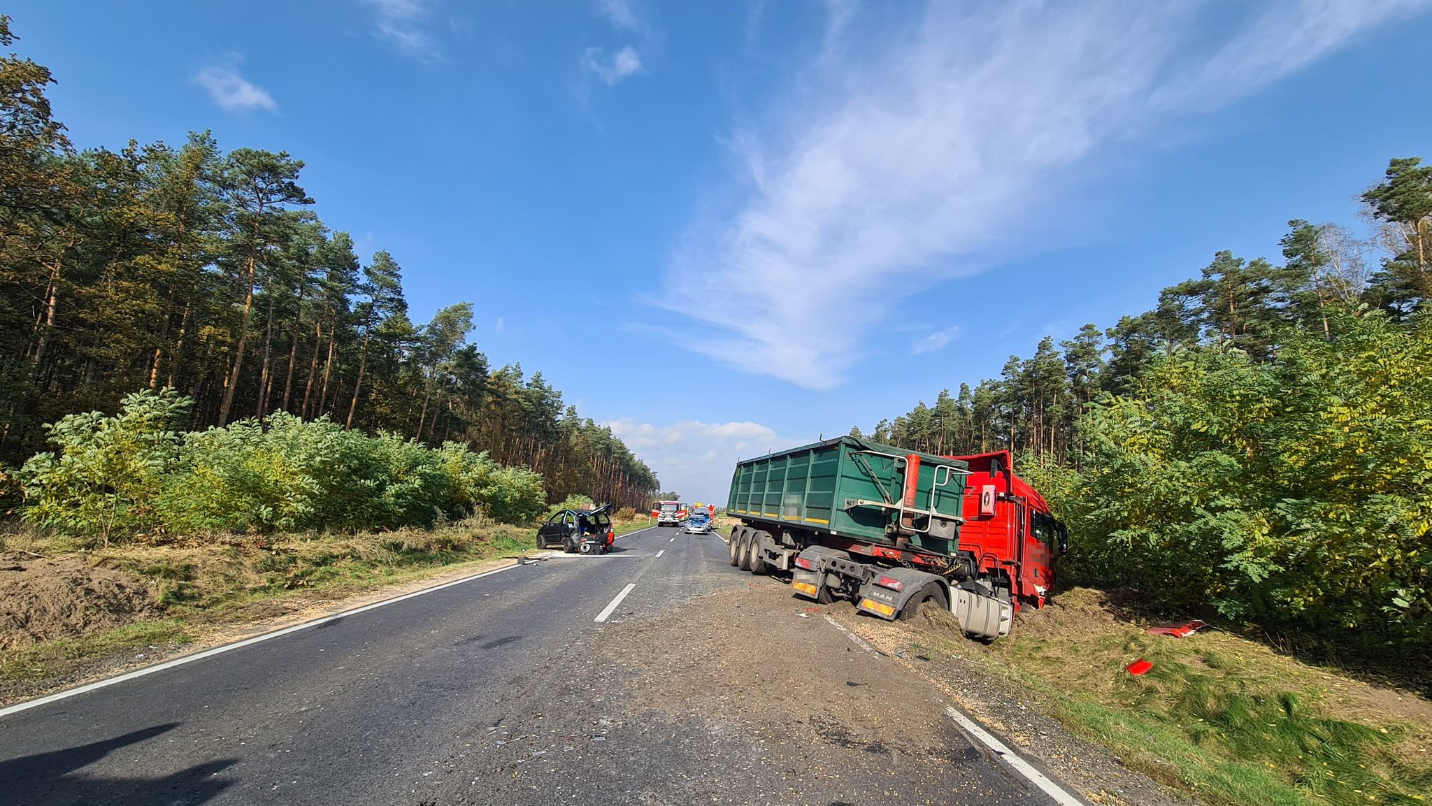 DK11/25 w Strugach nieopodal Antonina jest całkowicie zablokowana. Na miejscu pracuje pięć zastępów straży pożarnej (3 wozy z PSP i 2 z OSP) oraz policja, która będzie wyjaśniać okoliczności zdarzenia.