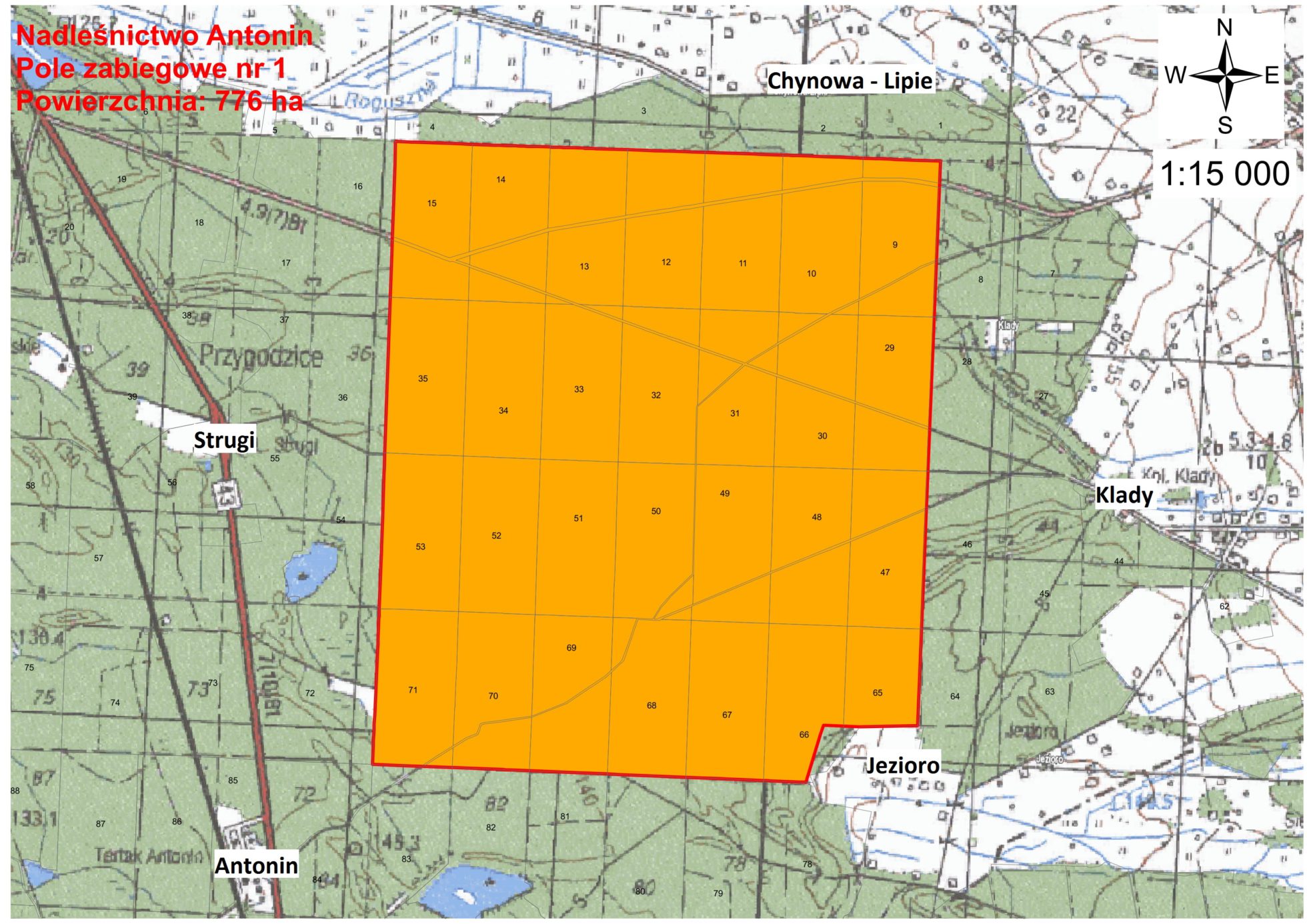 Pole zabiegowe nr 1: drzewostany w leśnictwie Klady w gminie Przygodzice, w okolicach miejscowości: Chynowa-Lipie, Klady, Jezioro, Antonin i Strugi.