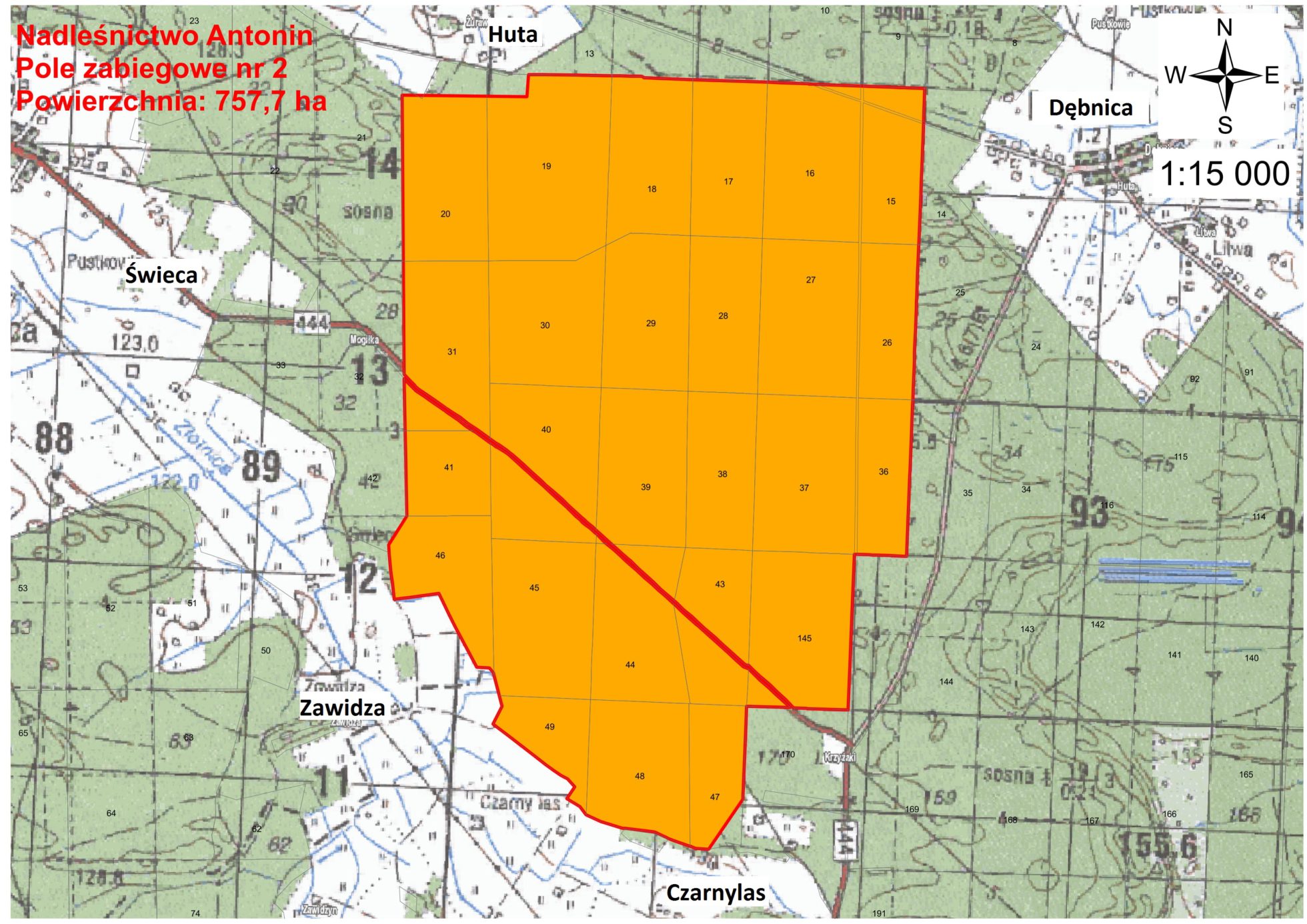 Pole zabiegowe nr 2: drzewostany w leśnictwach Czarnylas i Huta, w okolicach miejscowości: Dębnica, Huta, Świeca, Zawidza, Czarnylas (gminy Przygodzice i Odolanów).