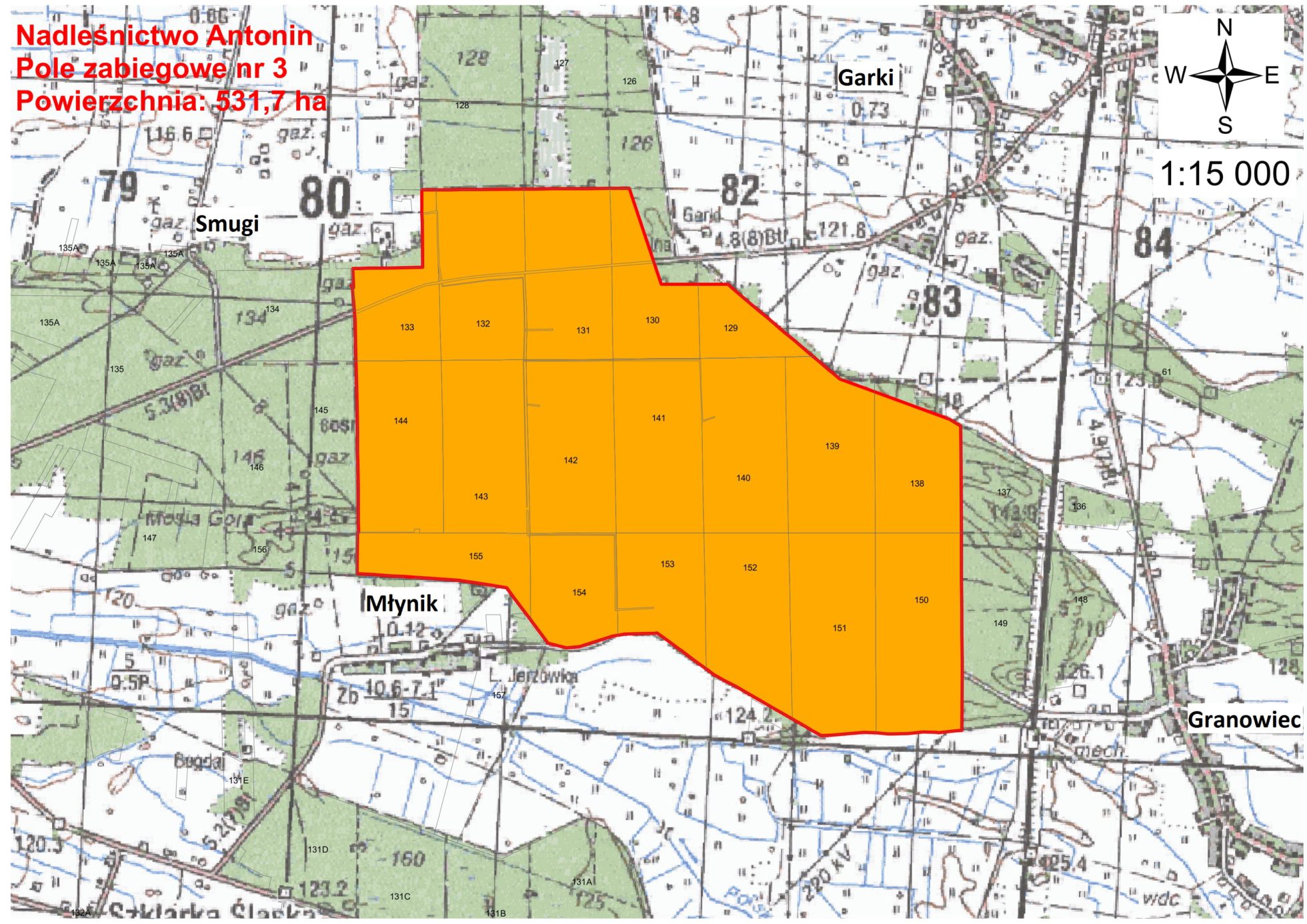 Pole zabiegowe nr 3: drzewostany w leśnictwie Jerzówka, w okolicach miejscowości: Młynik, Smugi, Garki, Granowiec.