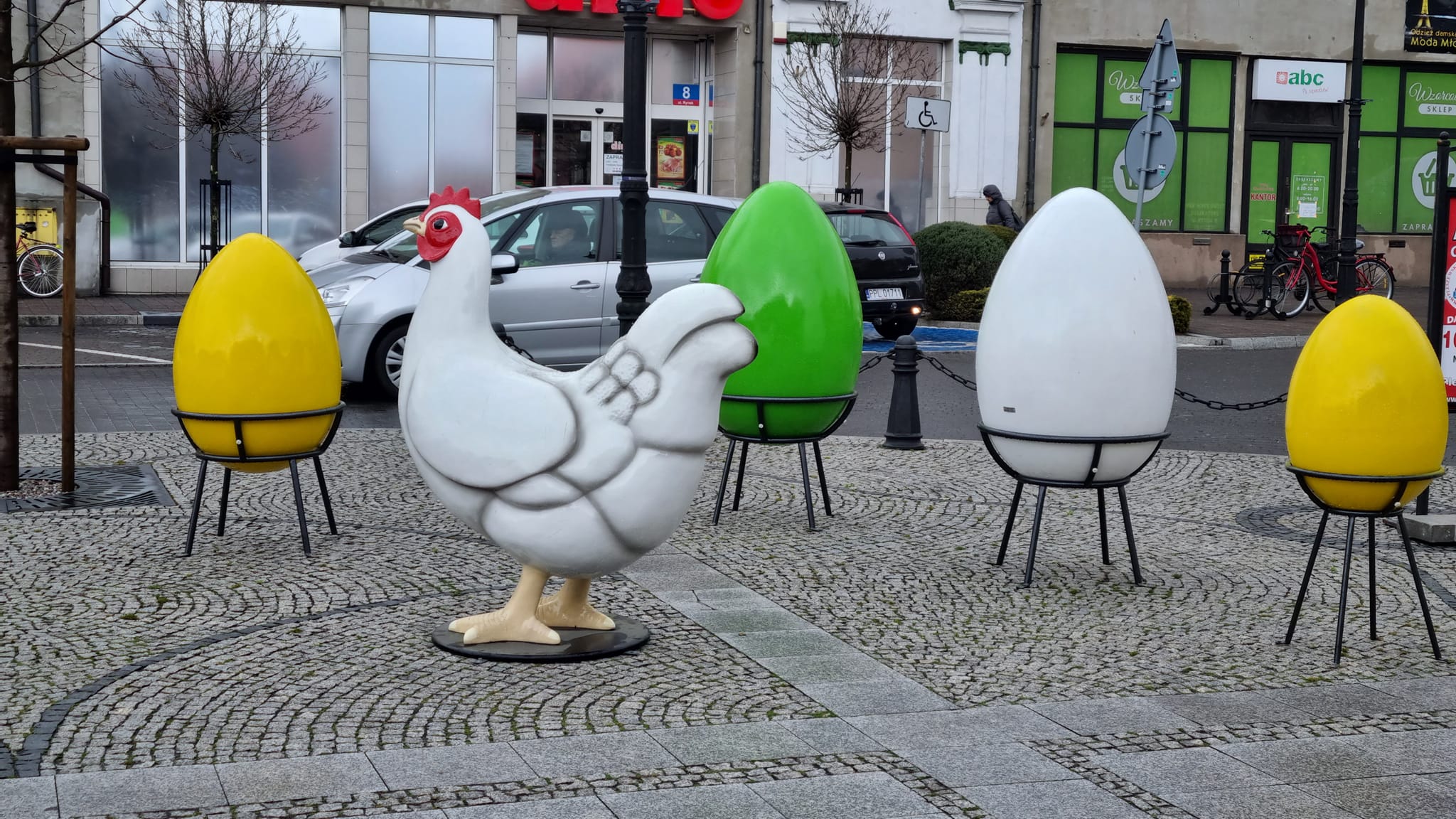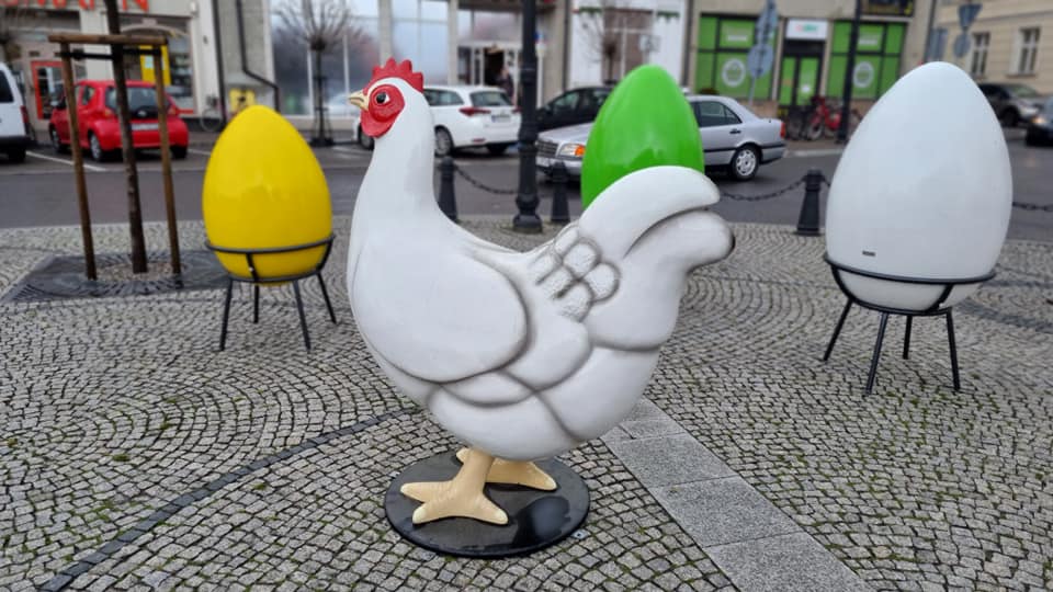Raptem tydzień dzieli nas od Wielkanocy, a to oznacza, że coraz więcej miejskich przestrzeni jest ozdabianych świątecznymi akcentami. Pleszewski rynek już wygląda świątecznie. przed ratuszem ustawiono kolorowe jajka, a pośrodku znalazło się miejsce na Kokorynkę, a więc kurę. Do tego dołączyły jajeczne ozdoby zawieszone na drzewach okalających płytę rynku. Ich autorami są przedszkolaki. Do ozdób wkrótce ma dołączyć zając.