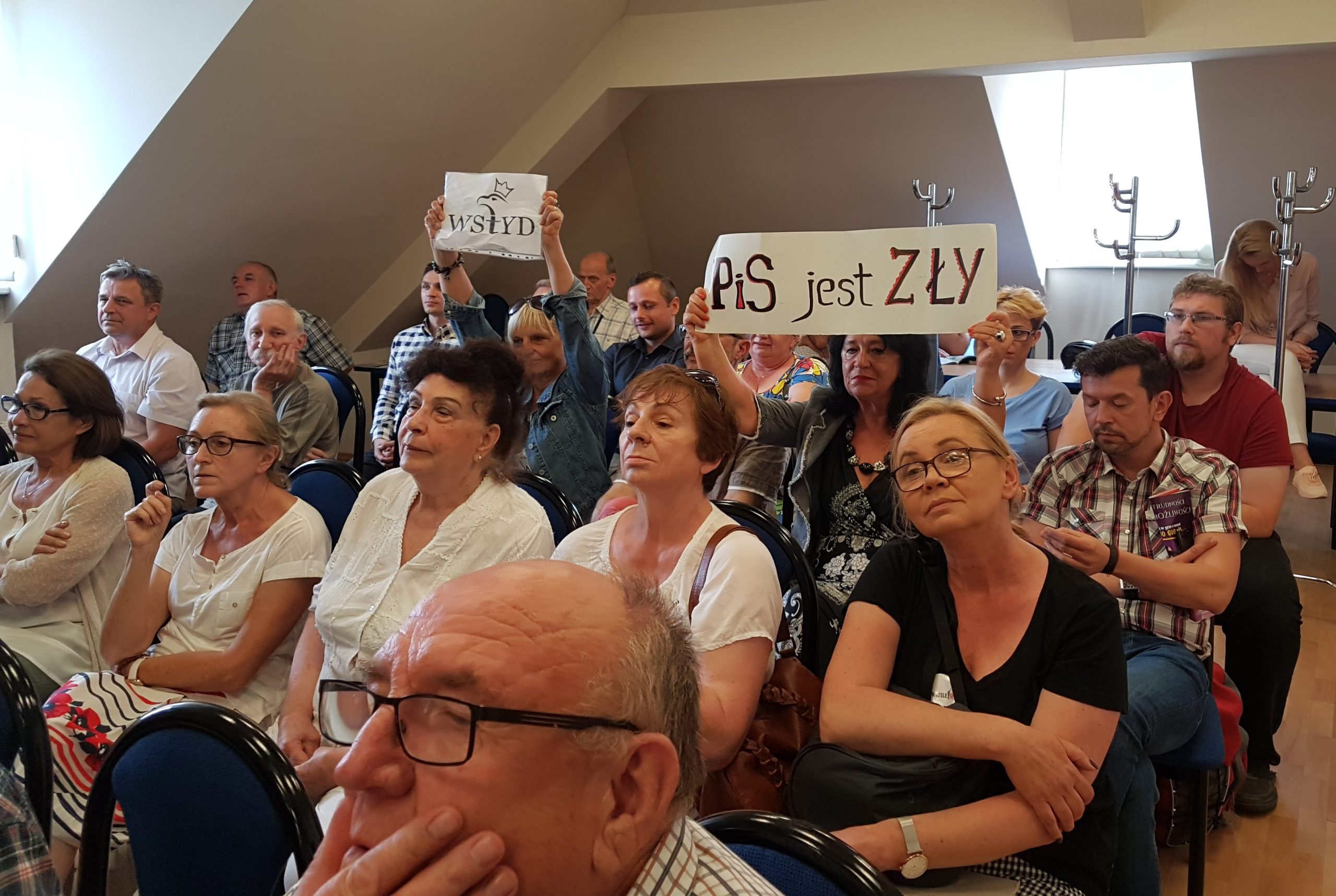 Pytania przedstawicieli KOD-u i Obywateli RP obecnych na spotkaniu, wzbudzały niechęć zwolenników PiS-u. Jak mówią przedstawiciele Komitetu Obrony Demokracji, usłyszeli z ich ust słowa: „wynocha”, „jesteście prowokatorami”, miały też paść wulgarne epitety. – Moja żona usłyszała „wy*** stąd szmato”. Powiedział to mężczyzna, który później zaatakował naszego kolegę, który dostał ataku epilepsji. Padło też „żywy stąd nie wyjdziesz”. Zbieramy filmiki, na których wszystko widać i zastanawiamy się, czy tego nie zgłosić do prokuratury – opowiada Wasiak.